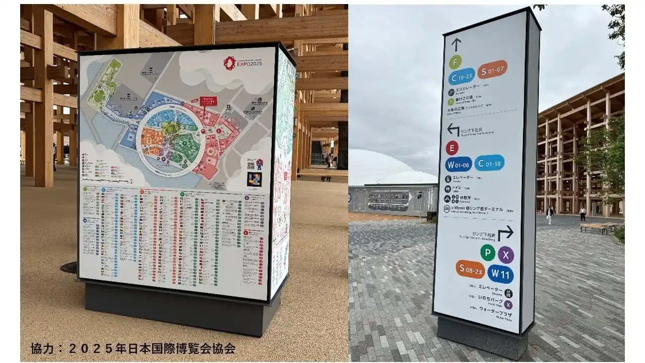 本製品の屋外掲出における鮮やかな発色や耐久性、再資源化できる環境性が評価され、大阪・関西万博会場内の案内サインとして万博敷地内に設置されました。 |