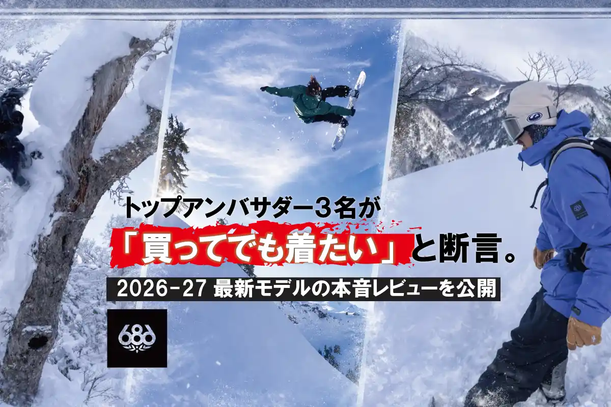 | 「Product is King」――常に革新を続ける686が贈る、2026-27最新コレクション。一着のウェアがライディングをどう変えるのか、その答えを知るのは雪山を誰よりも滑り倒すアンバサダーたちです。本リリースでは、佐藤秀平、山崎恵太、米野舜士ら3名が「自ら選んだ一着」を徹底レビュー。スペック表の数値を超えた、現場での動きやすさ、温度調節のリアル、そしてシルエットへのこだわり。4月30日の予約締切を前に、プロが命を預けるウェアの「真価」を提示します。 | |||||||||||||||||||