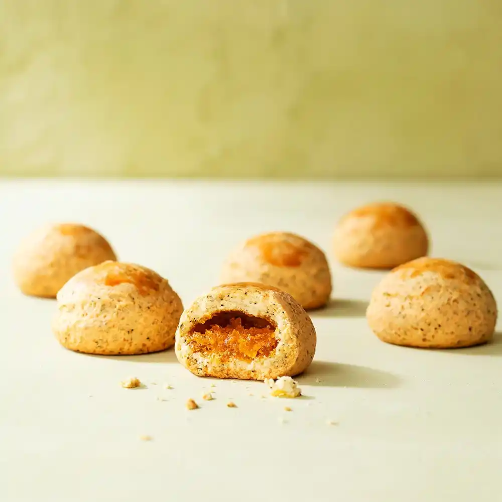 アールグレイ茶葉を練り込んだ香り高いスコーンに、爽やかに香る果皮入りのオレンジジャムを包み込み、コロンとしたかわいらしい形に焼き上げました。口に入れた瞬間にベルガモットの香りが華やかに香り立ち、ほろりと軽やかにほどけます。じっくりと焼き上げることで、柑橘本来の爽やかさとアールグレイの芳醇な香りが重なり合い、ひと口ごとに上質な香りの余韻が広がる贅沢なスコーンに仕上がりました。 |