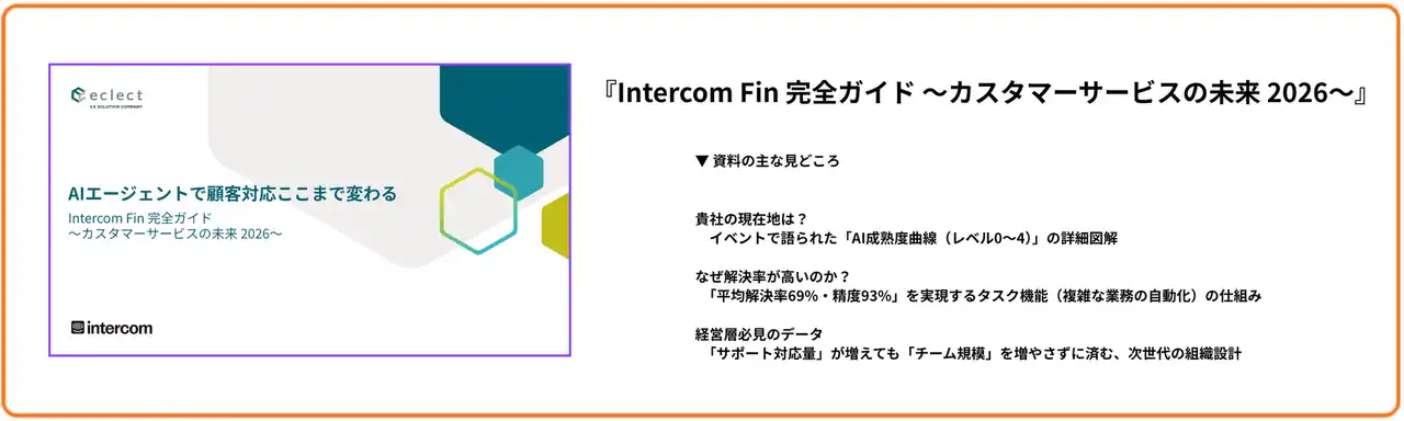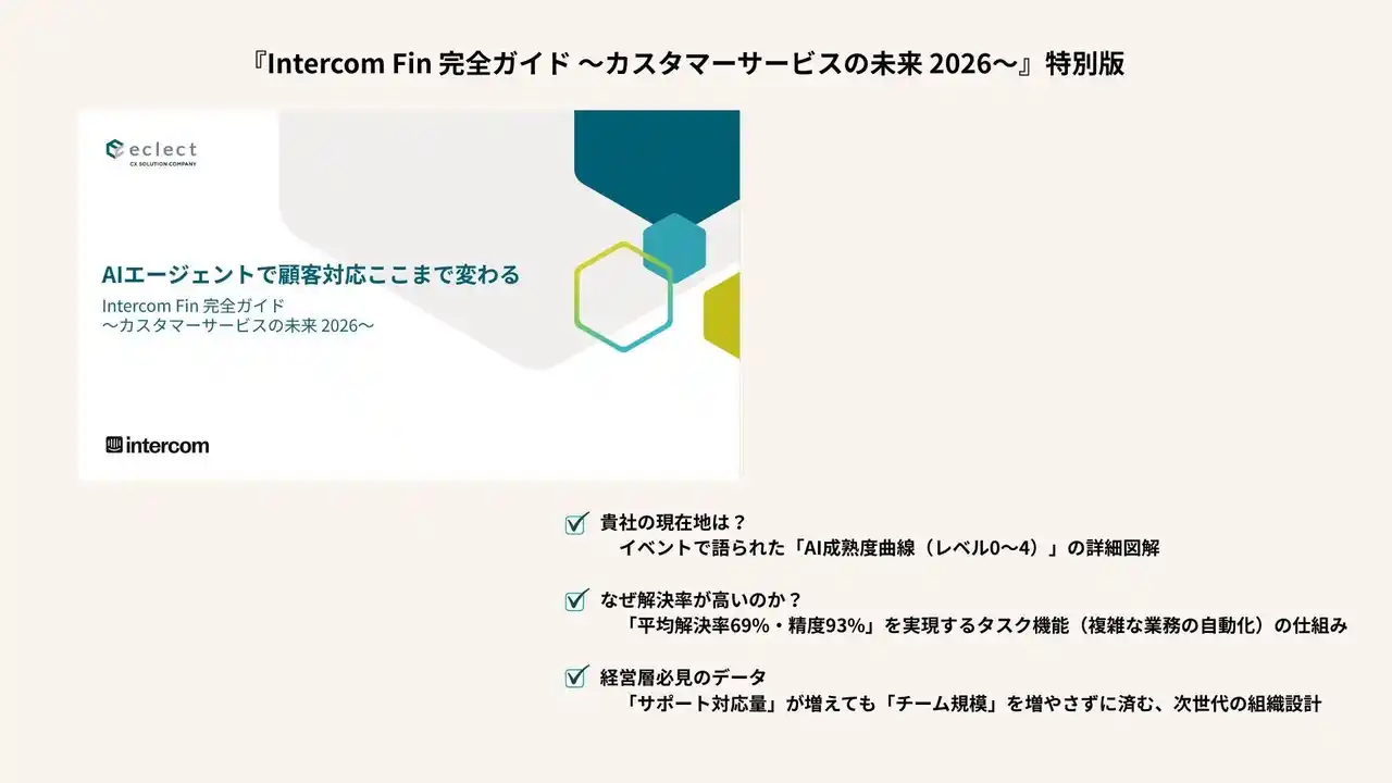 | 本イベントで大きな反響を呼んだ、AIエージェント「Fin」の全体像と具体的なビジネスインパクトをまとめた特別資料『Intercom Fin 完全ガイド ~カスタマーサービスの未来 2026~』を、本レポート記事を読まれた企業様、AIエージェント導入をご検討中の企業様向けに、特別に無料配布しています。 | ||||||||||||