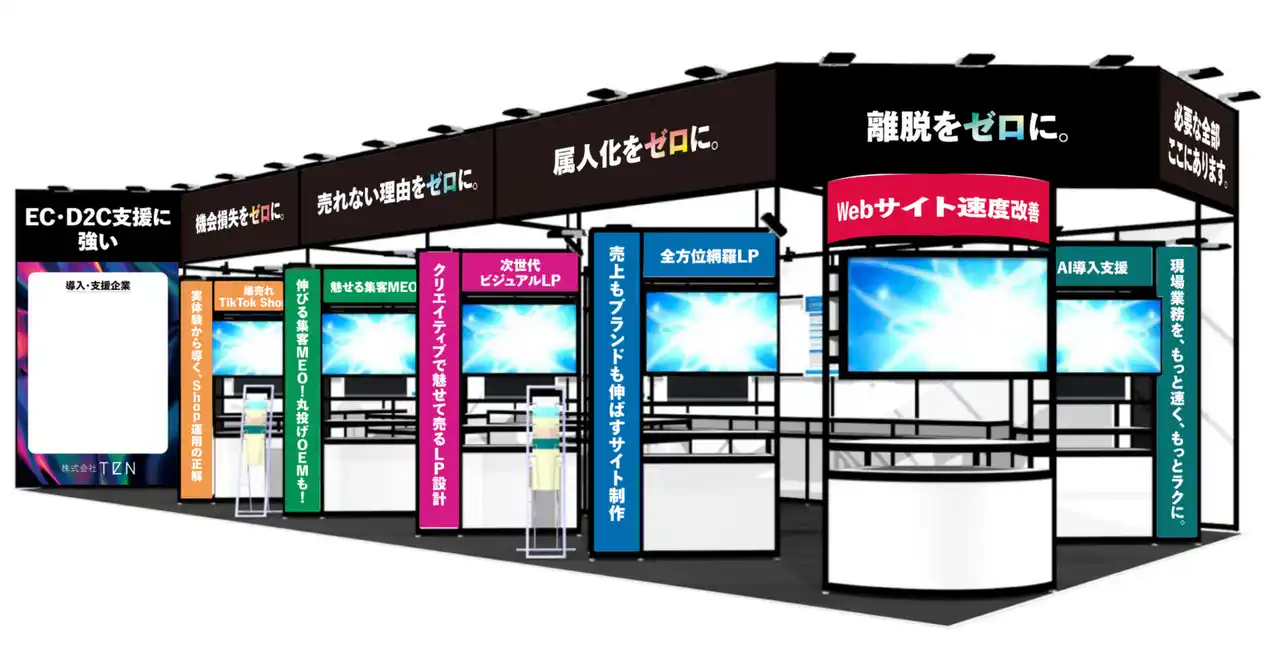 TeNブースでは、最新AI技術、LP・ショート動画の制作、MEO対策、Web高速化SaaSおよびTikTokショップ運用による確実な売上転換まで、次世代のマーケティング戦略をワンストップでご体感いただけます。「AIをどう活用すべきか」「サイト離脱を防ぎたい」「若年層に刺さる動画を作りたい」といった課題をお持ちの企業担当者様に、劇的な成果を生む具体的なソリューションをご提示します。 |