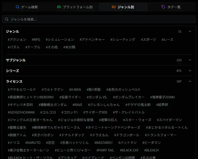 従来の大まかなジャンル区分に加え、サポートジャンル(サブジャンル、シリーズ、ライセンス)をゲームごとに設定しました。 |