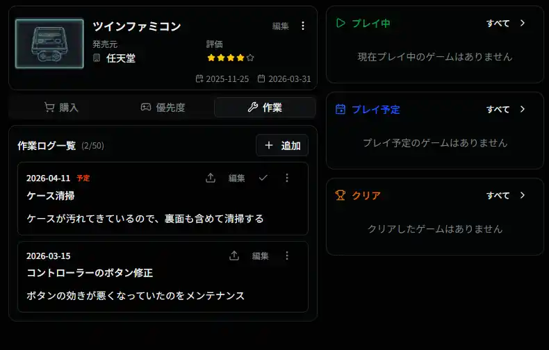 登録したゲーム機ごとにメンテナンスの記録を残せるようになりました。 |