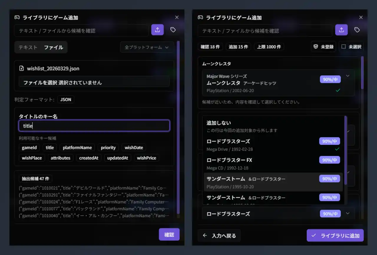 プレミアム会員向けには、タグを指定して該当ゲームをまとめて登録するタグ一括登録も利用できます。確認時にはタイトルごとの一致率も表示されるため、取り込み時の確認もしやすくなっています。 |