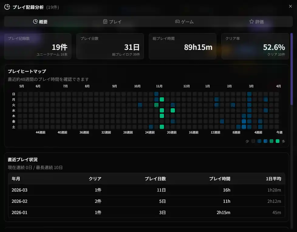 表やグラフから対象タイトルへたどれるドリルダウンにも対応し、いつ・何を・どう遊んだかを振り返ったり、積みゲー消化の傾向を掴んだりするのに役立ちます。 |
