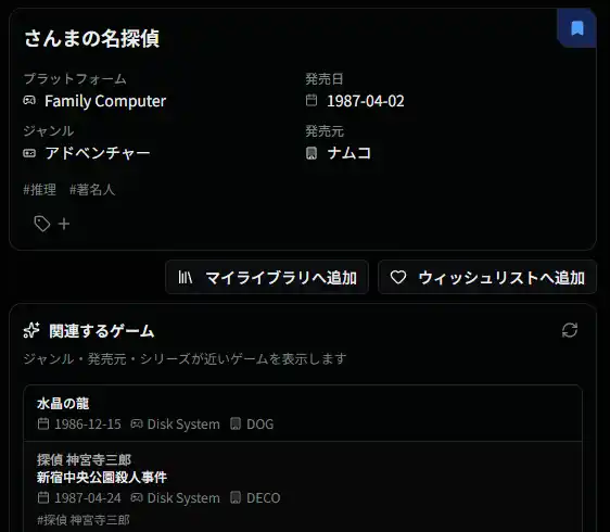 RGGは所有しているゲームの管理はもちろん、「プレイ中」「クリア済み」といった進捗ステータスの管理、さらにはウィッシュリストによる購入検討までをワンストップで行える Web サービス(PWA)です。20,000件以上の国内ゲームデータベースを検索し、誰でもお手軽に自身のライブラリを作成することができます。 |