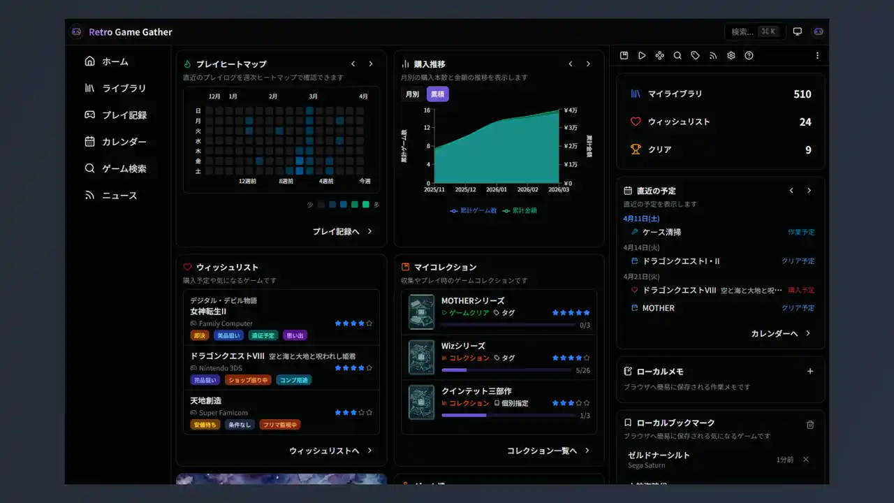 今回のアップデートでは、プレイログを軸として「いつ・何を・どう遊んだか」を把握できるプレイ記録分析機能、タイトルテキストやファイル、タグ指定といったライブラリ一括登録手段の拡充、そして「同一ゲームの複数ソフト所有」や「ゲーム機メンテナンスの時系列記録」を可能とするプレミアム機能の強化もあわせて実施しています。 |