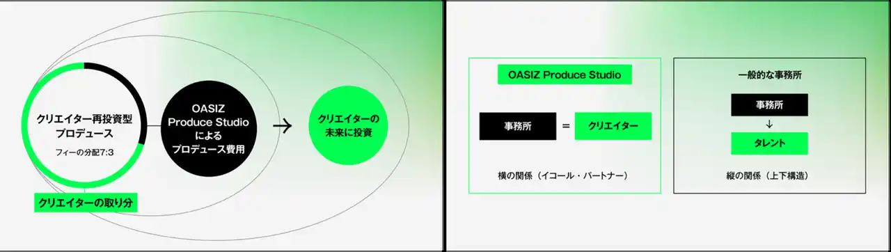 元々、事務所は絶対作らないと決めていたのですが、クリエイター個人の価値を中長期的に拡張していくためには、構造そのものを見直す必要があると感じていました。クリエイターを管理するのではなく、対等なパートナーとして共にビジネスを創るプロジェクトとして立ち上げたのが「OASIZ Produce Studio」です。 |