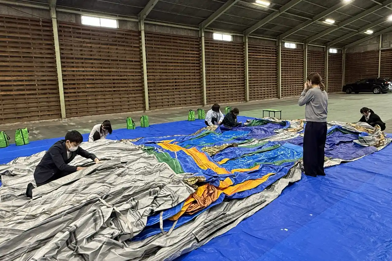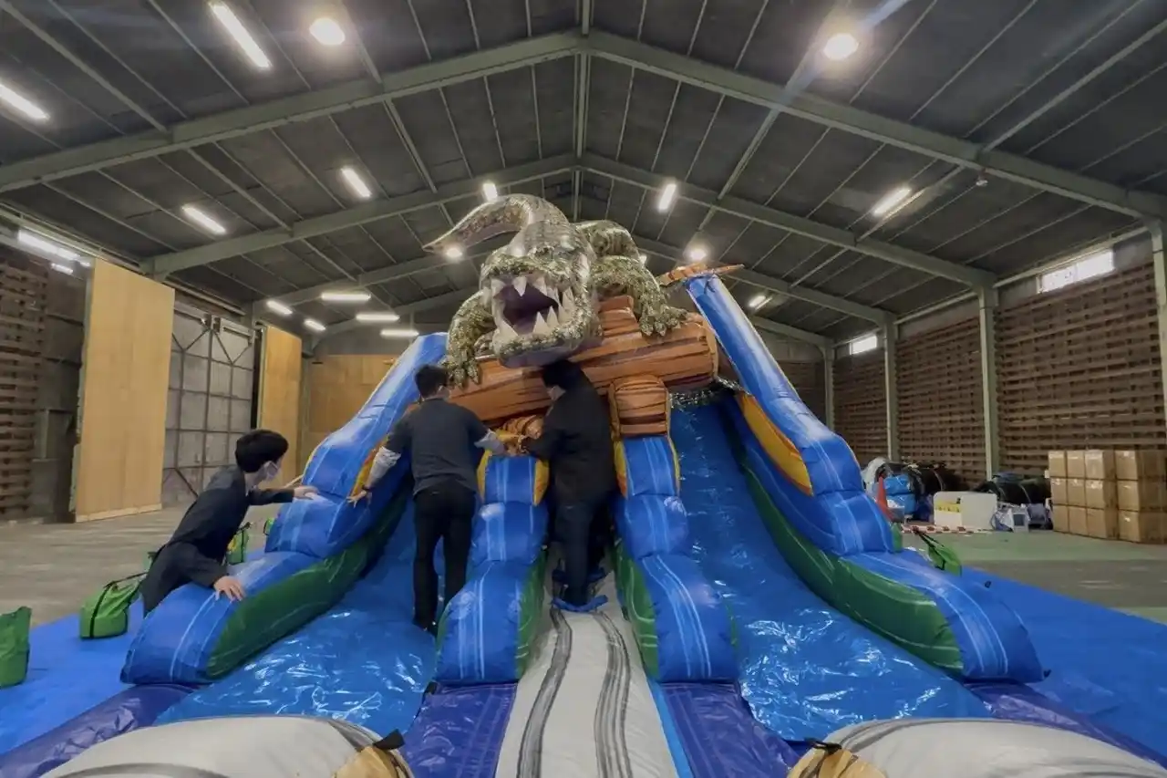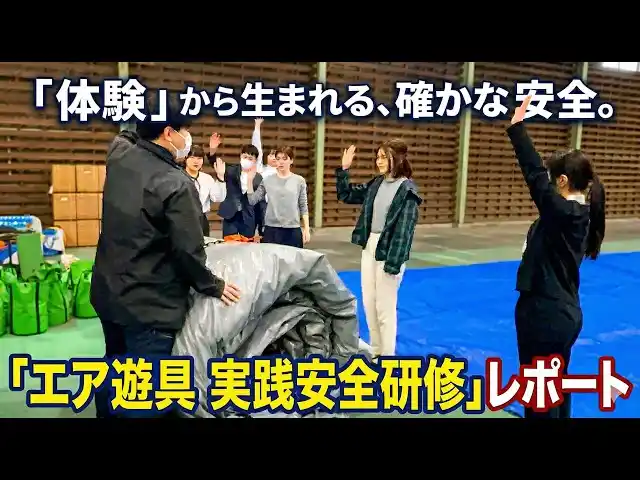 | 本研修では、大型エアスライダーの実機を使用し、設営から緊急時の対応までを実体験。社員一人ひとりが遊具の特性を体をもって学ぶことで、現場での安全な運営はもちろん、お問い合わせ段階から専門知識に基づいた正確なサポートを提供できる体制を強化してまいります。 | |||||||||