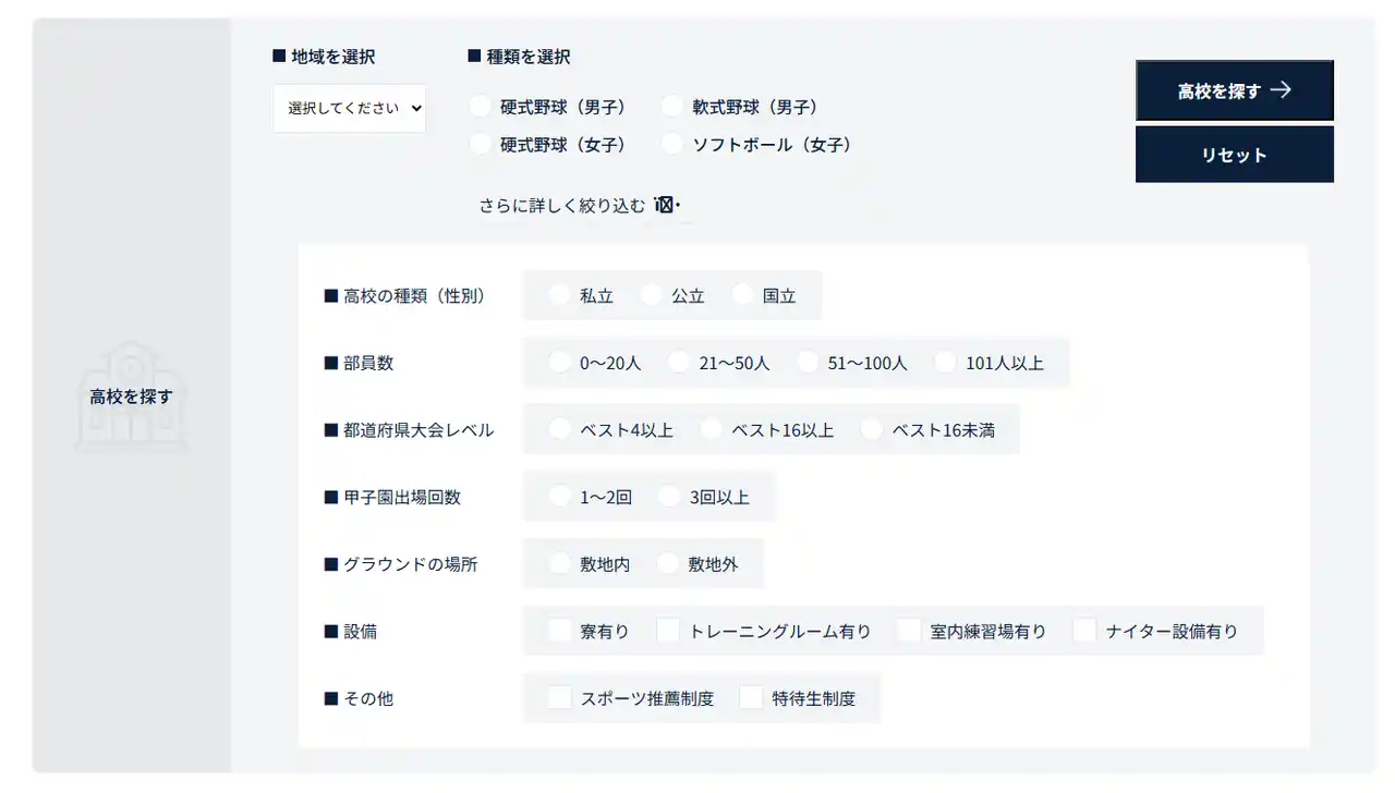 知名度や人づての情報だけでなく、中学球児や保護者が自分の意思で「自分に合った高校」をより詳細に検索することが可能になりました。これまで知らなかった新たな高校と出会うチャンスを創出します。 |