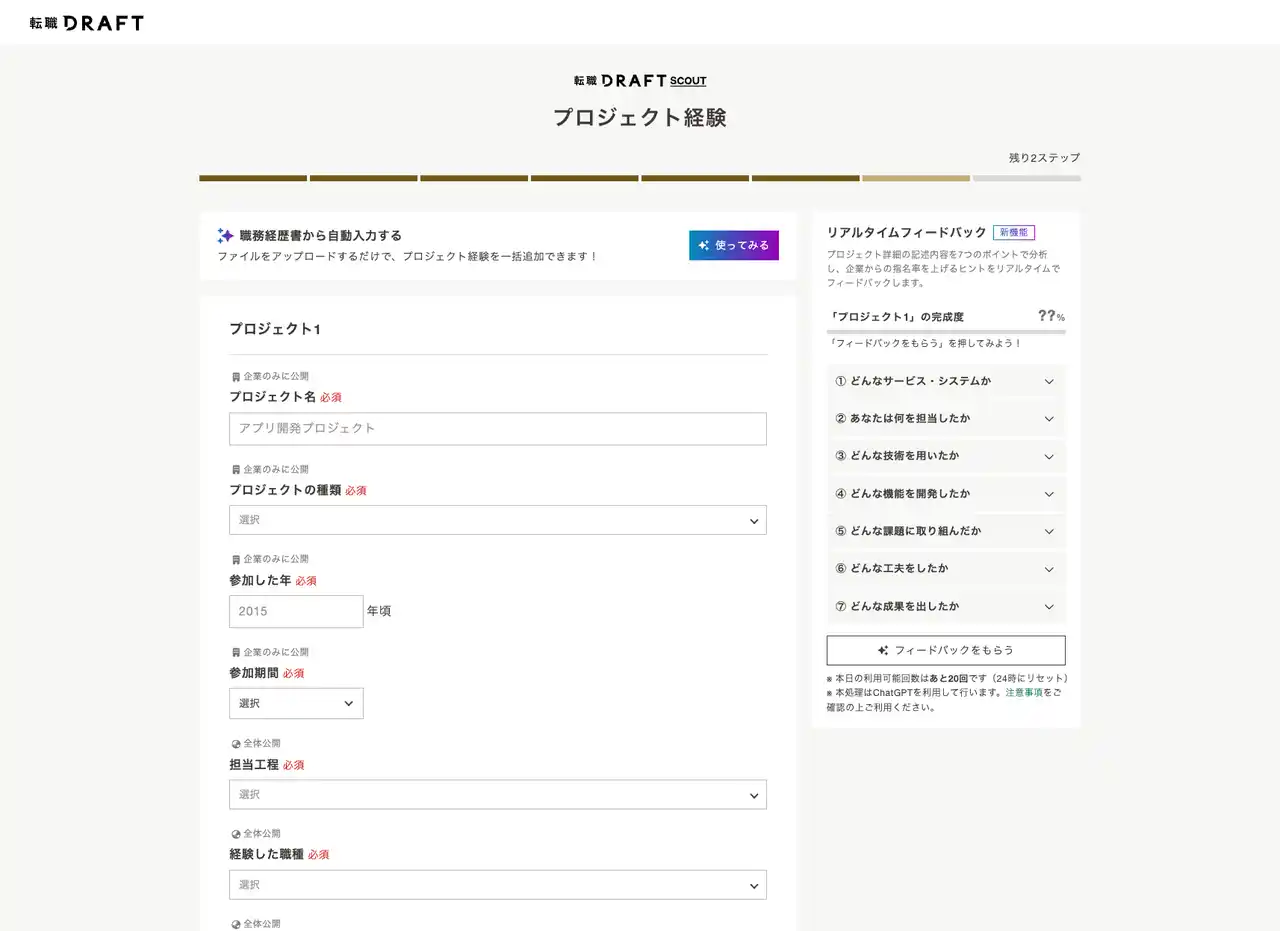 会員登録時の情報入力フォームの「プロジェクト経験」の登録ページにて、「フィードバックをもらう」ボタンをクリックすることで利用することができます。 |