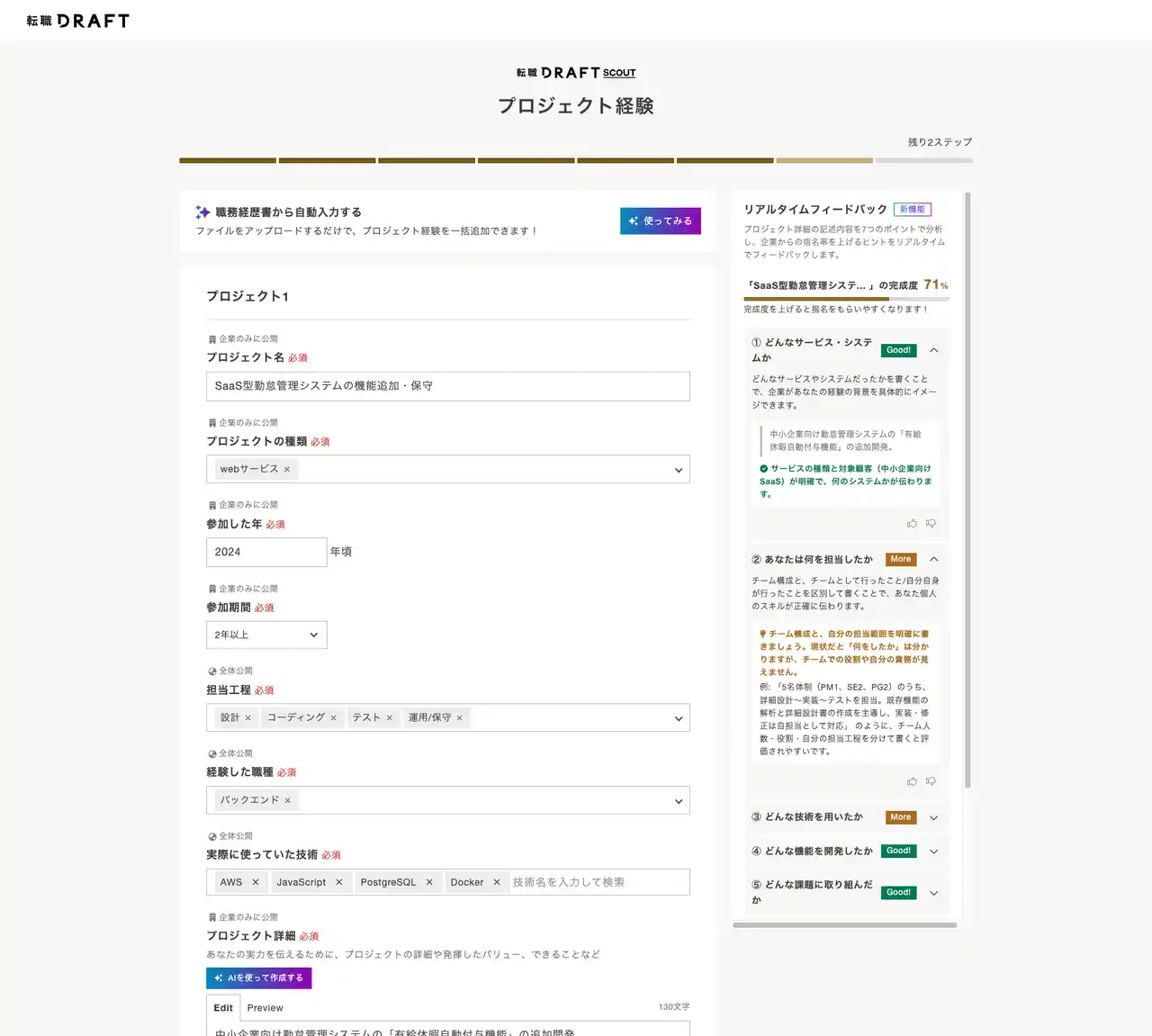 株式会社リブセンス(代表取締役社長:村上太一、本社:東京都港区、証券コード:6054)が運営する『転職ドラフト』(URL:https://job-draft.jp/)は、企業からの指名獲得に向けた「プロジェクト経験」の作成をサポートする「リアルタイムフィードバック機能」を提供開始しました。これまで「どう書けば魅力が伝わるかわからない」と悩んでいた求職者も、経験やスキルを魅力的に企業に伝える質の高い職務経歴書(レジュメ)を作成でき、企業からより良いスカウトを獲得する可能性を高めることが期待できます。本機能は現状では新規会員登録時に提供されるものですが、今後既存会員向けの同様のサービス提供を予定しています。 |