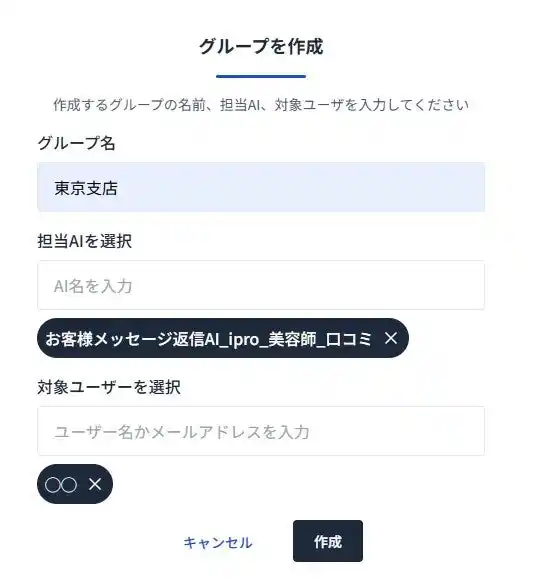 1つのアカウントの中で、店舗・AIごとにグループを作成し、スタッフへのアクセス権限を細かく設定できる機能。数十店舗規模のサロングループでも、アカウントの切り替えなしに全店舗のAIを一元管理できる。 |