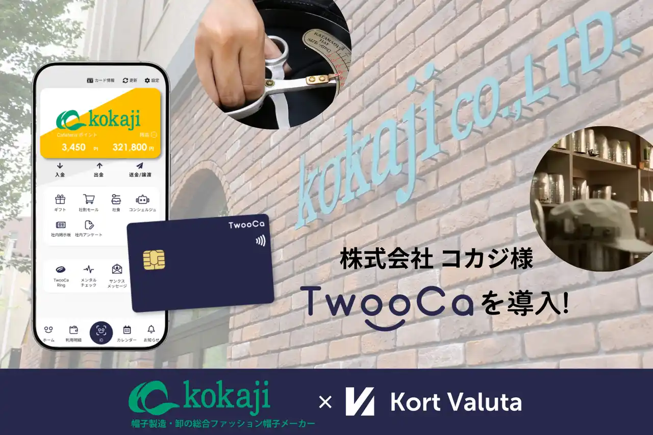 株式会社Kort Valuta(本社:東京都渋谷区、代表取締役:柴田秀樹、以下「当社」)は、株式会社コカジ(本社:大阪府箕面市、代表取締役社長:古鍛治豊道、以下「コカジ」)が、従業員向け福利厚生の利便性向上および業務効率化を目的として、次世代型ウォレット「TwooCa(ツウカ)」*1を導入したことをお知らせいたします。 |