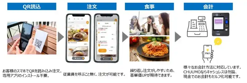| 「CHUUMO」は、アプリのダウンロードやユーザー登録が不要で、QRコードをスマホで読み取り、来店客がセルフで飲食店での注文から会計までを済ませることが可能なサービスです。受注業務、会計業務をセルフ化することで、飲食店様における人手不足の解消に寄与します。来店客のスマートフォンでのキャッシュレス決済に対応の他、インバウンドにも対応しております。また、マミヤ・オーピーグループの経営基盤を活かした手厚いサポート体制が整っており、全国に保守拠点、365日対応可能な自社コールセンターを構えております。 | |||
