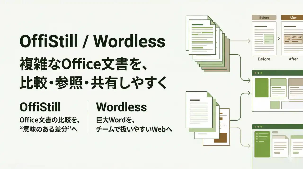 OffiStillとWordlessを通じて、複雑なOffice文書の比較・参照・共有・更新を実務で扱いやすい形へ変えていきます |