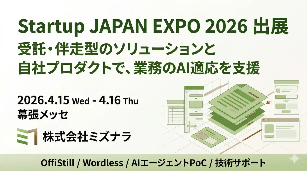 株式会社ミズナラ(本社:東京都中央区月島、代表取締役:木下祐馬)は、2026年4月15日(水)・16日(木)に幕張メッセで開催される「Startup JAPAN EXPO 2026」に出展いたします。 |
