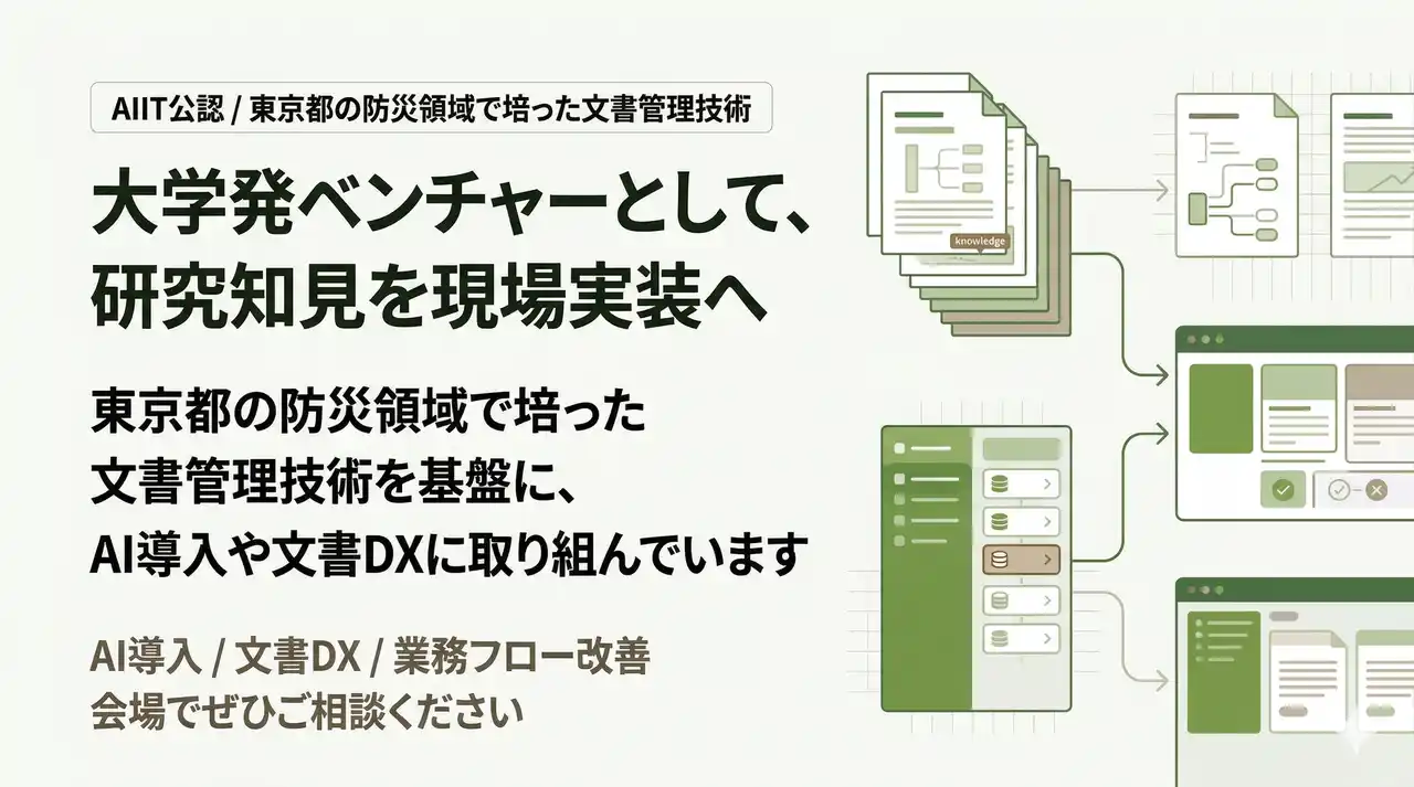 AIIT公認の大学発ベンチャーとしての研究知見と、東京都の防災領域で培った文書管理技術を基盤に、会場で具体的なご相談を受け付けます |