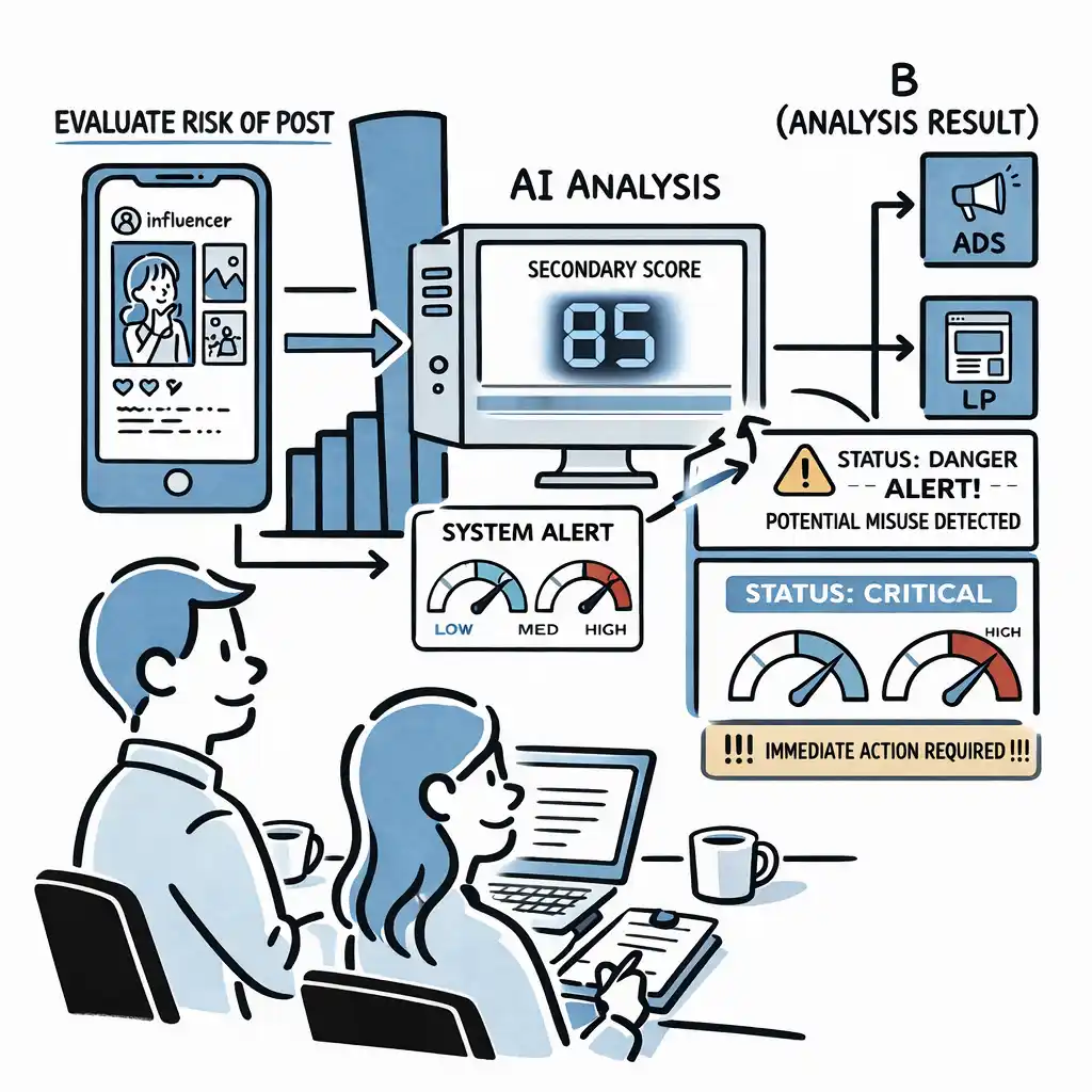 同時に、投稿素材がはらむ法的リスク(薬機法・景表法・著作権侵害)や、ブランド毀損・SEO低下につながる危険度(safetyRatings)を事前に検知し、企業様が安全かつ効果的に良質なクリエイティブをご活用いただけるインフラを提供いたします。 |