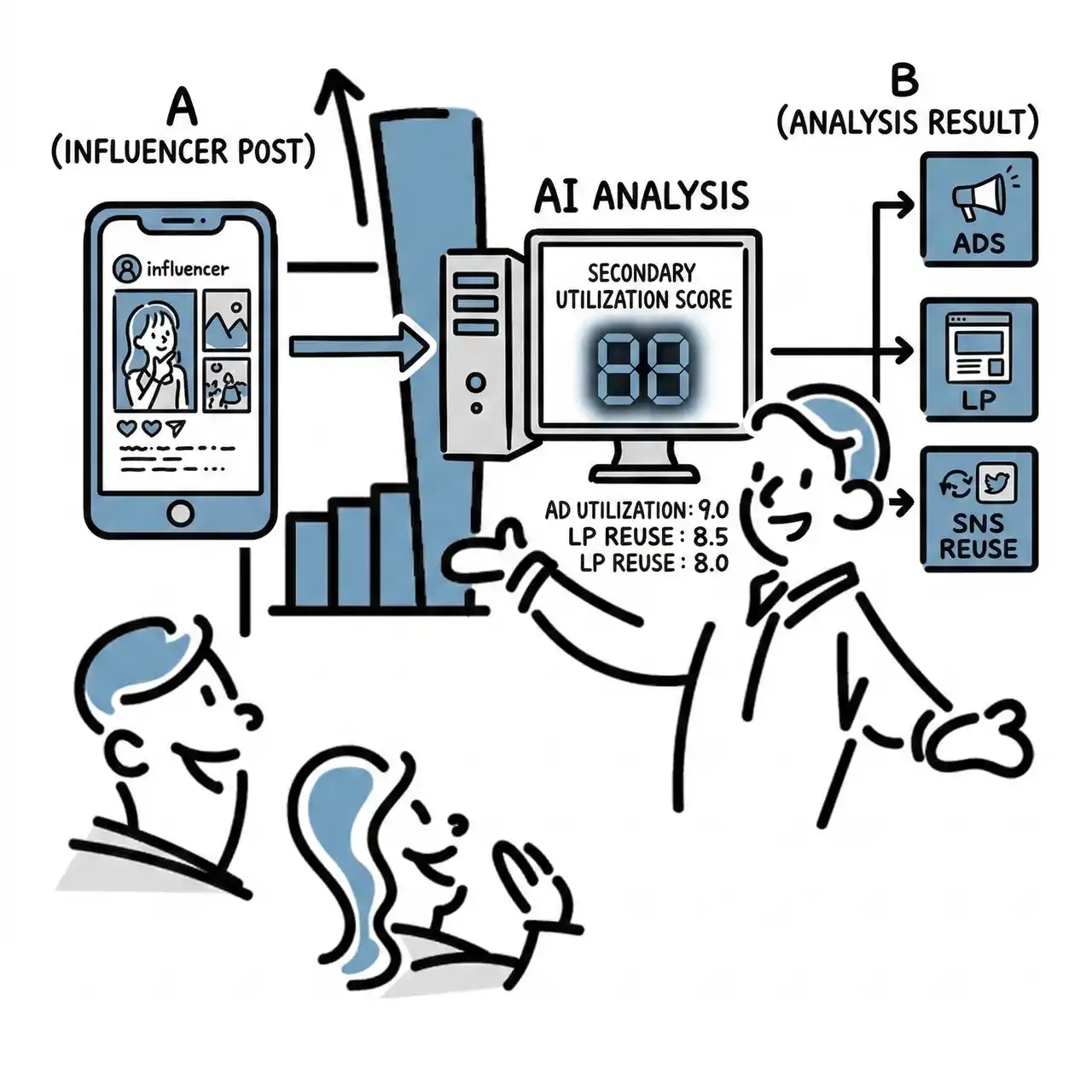 これまでは、インフルエンサーに二次利用許諾をとった素材を単純に提供する形が主流でしたが、本機能の導入により、今後は「広告素材としての高いポテンシャル(二次利用価値)」と「それに付随する潜在的なリスク情報」をセットでご提供することが可能となります。 |