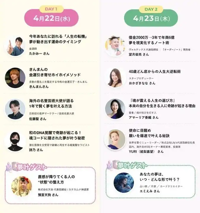 夢を語ること自体にためらいを感じる人が増える中、その空気に一石を投じる新たな試みとして、株式会社イシス(本社:東京都武蔵野市、代表取締役社長:渡辺 美佳子)は、『親子の法則 人生の悩みが消える「親捨て」のススメ』や『金のなる本』の著者で、作家・メンタルトレーナーとして活動する三凛さとし氏をプロデューサーに迎え、2026年4月22日(水)から25日(土)までの4日間、オンラインイベント『夢叶フェス(ゆめかなフェス)』を開催いたします。 |