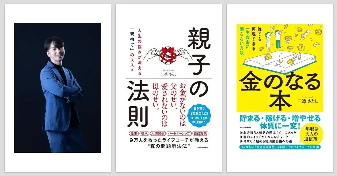 著書に、親子関係の本質的な課題解決を提唱したベストセラー『親子の法則 人生の悩みが消える「親捨て」のススメ』、および『金のなる本 誰でも再現できる一生お金に困らない方法』(ともにKADOKAWA)があり、累計発行部数は7.5万部を突破。 |