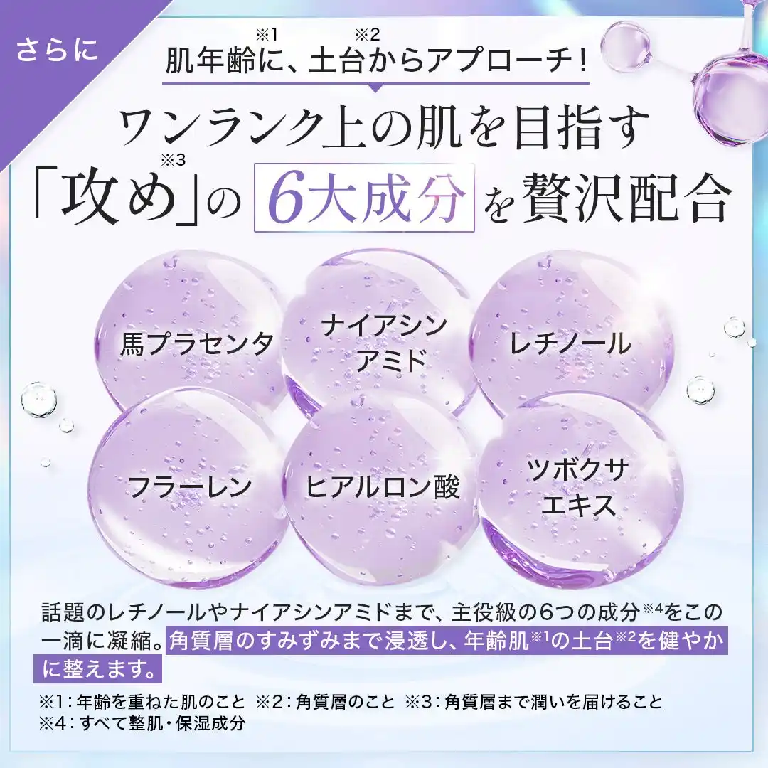 | 重要な成分にはナノカプセル化・リポソーム加工を施すことで、角質層までの浸透設計にこだわりました。 | |||||||||