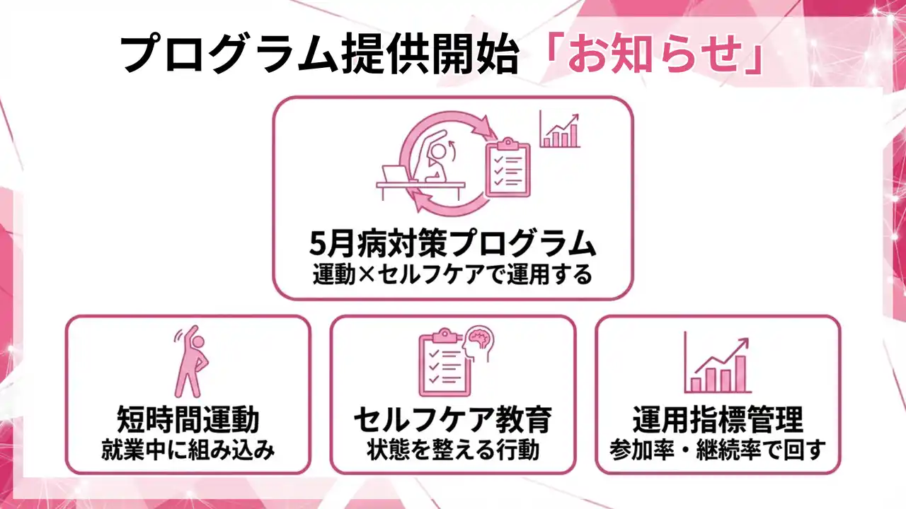 本プログラムは、4月の環境変化とGW明けの失速で起きやすい5月病対策を、短時間運動とセルフコンディション教育で実装し、参加率・継続率などの運用指標で回す支援です。 |