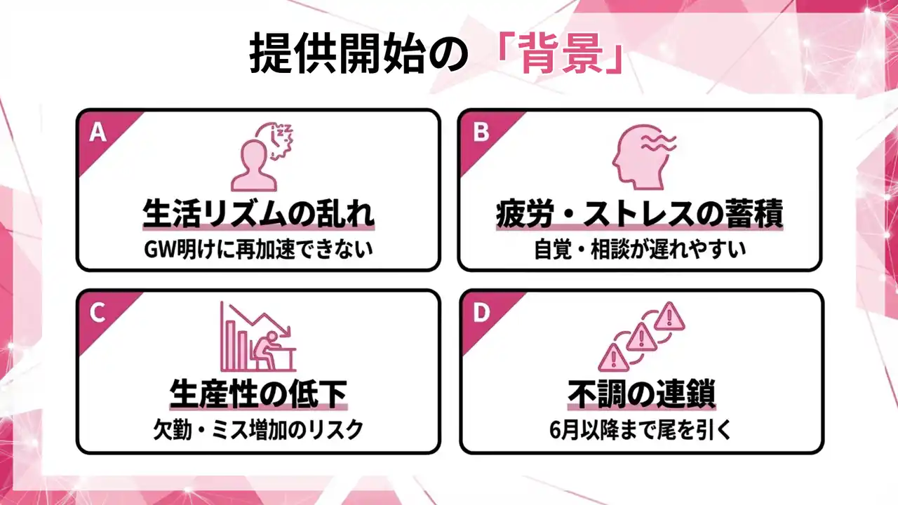 この局面で起きやすい課題は、生活リズムの乱れ、疲労の蓄積、ストレスの自覚の遅れ、相談の出遅れです。結果として、欠勤・遅刻早退、集中力低下、ミス増加、プレゼンティーイズム(出勤しているが生産性が落ちる状態)といった形で表面化し得ます。 |