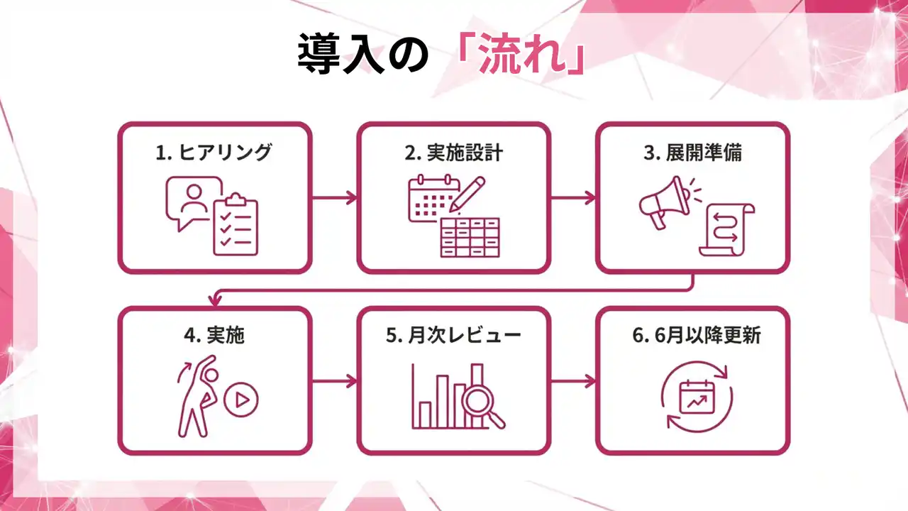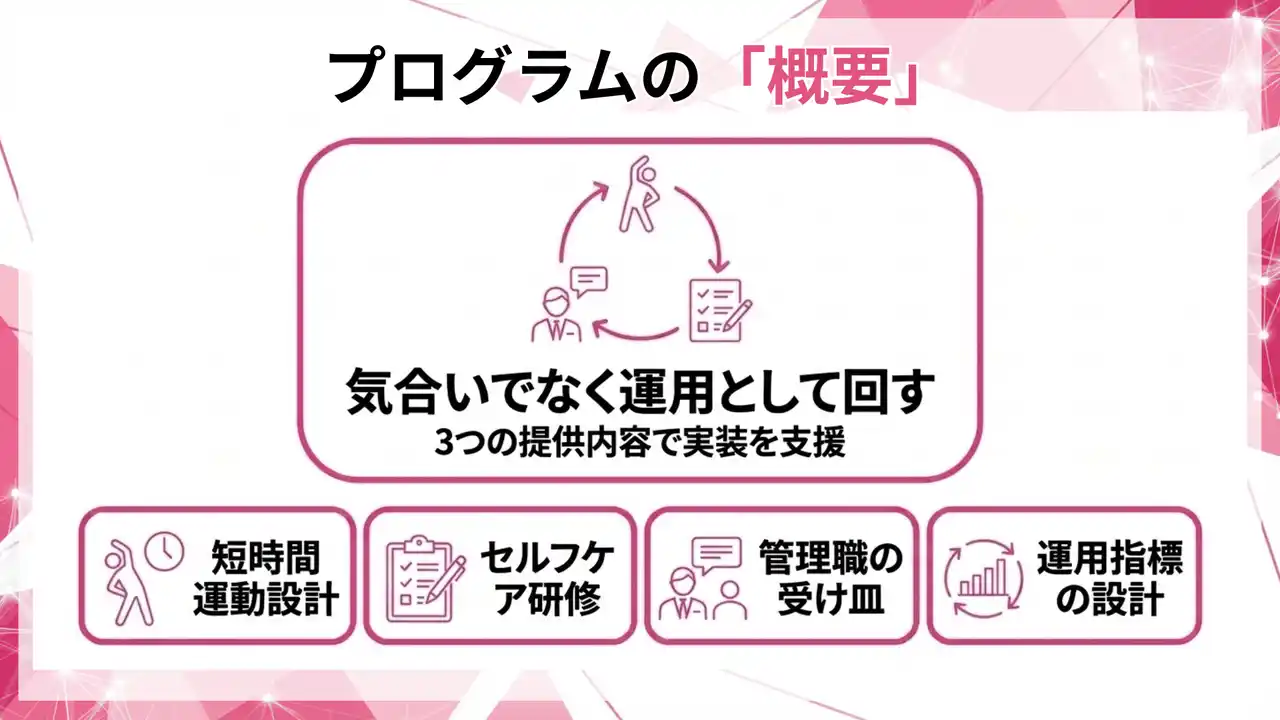 就業中に実装できる短時間の運動機会と、従業員が自分の状態を整えるセルフコンディション教育を組み合わせ、参加率・継続率などの運用指標で回る形に設計します。 |