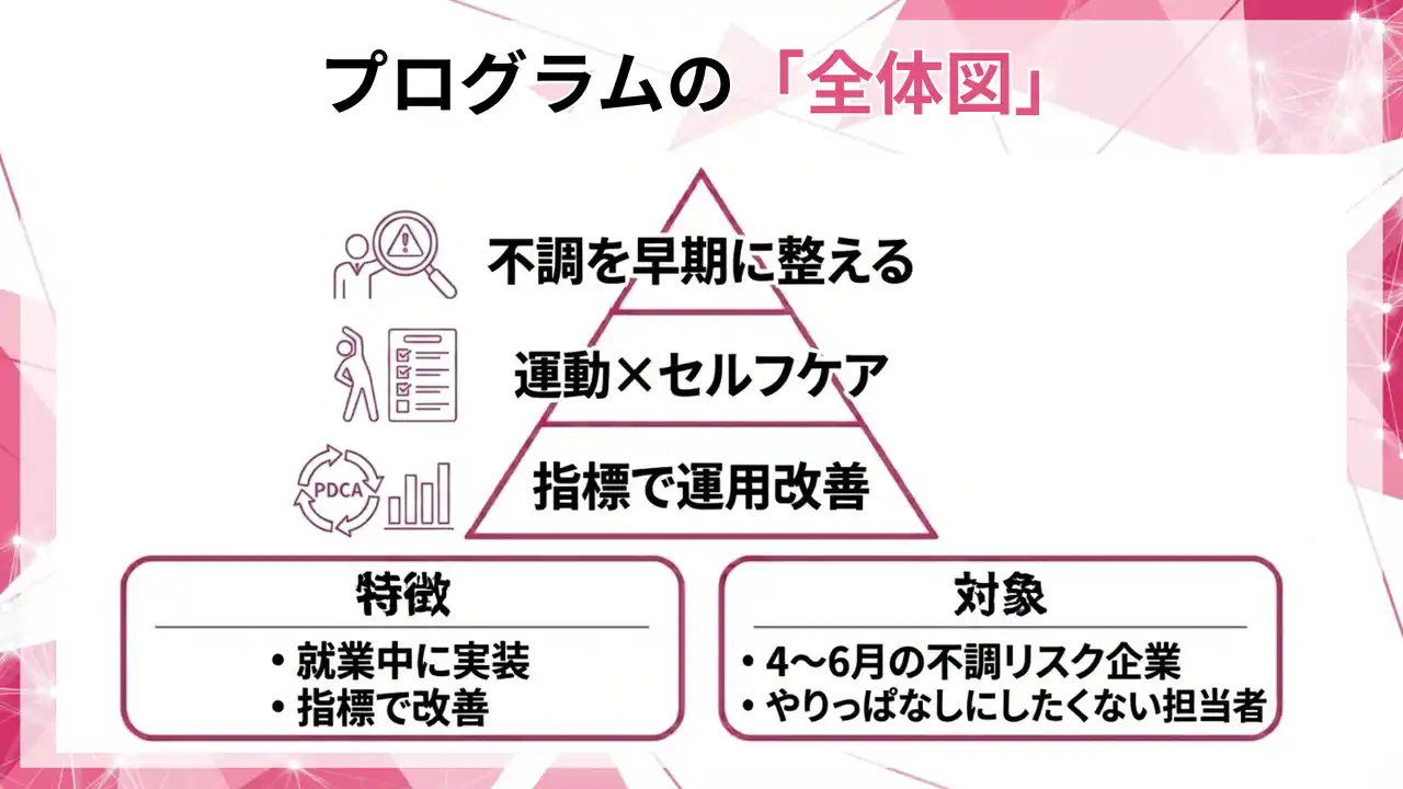 本プログラムは、5月だけでなく6月以降に連鎖し得る不調の入口を、運動習慣とセルフコンディションの共通言語で早期に整えることを目的とします。 |