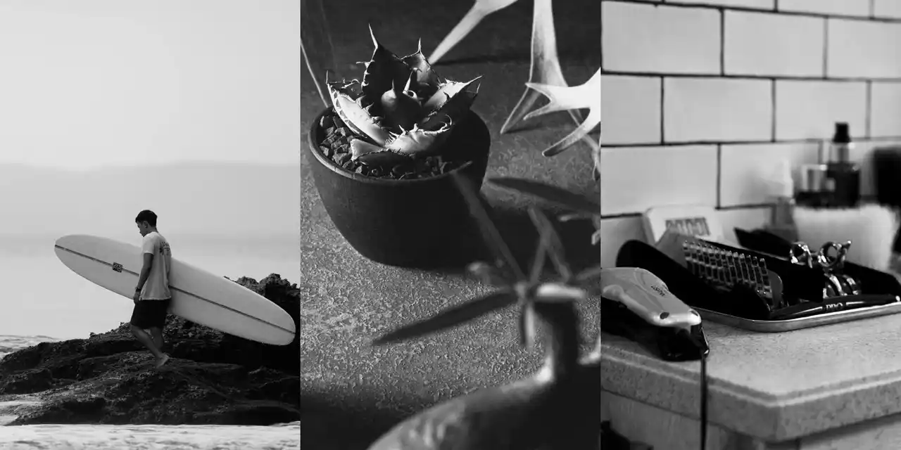 TRUNCAの特徴は、サーフ・プランツ・バーバーという異なるカテゴリを単に並べるのではなく、ひとつの価値観として編集している点にあります。店内では、サーフカルチャーをルーツに持つPADROLのサーフボードやギア、アパレルをはじめ、植物の呼吸を感じさせるELK Leaves、そしてBARBER SUNRIDEの世界観やアイテムが自然に交差します。 |