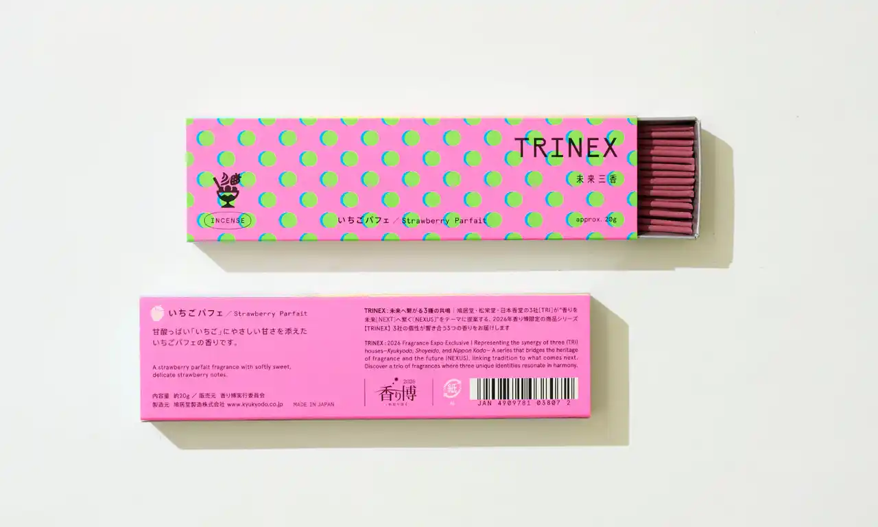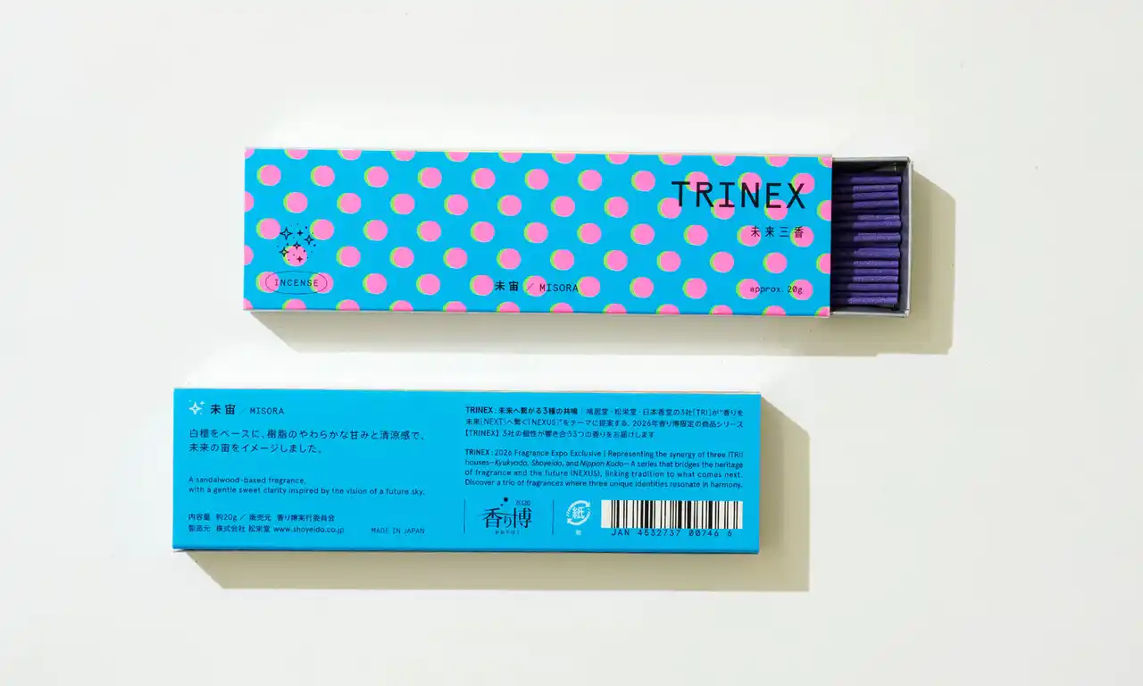 「TRINEX〈未来三香〉」は、香り博2026のテーマ「明日につなげる香り -Where Scents Meet Tomorrow-」をもとに、鳩居堂・松栄堂・日本香堂の3社(TRI)が、“香りを未来(NEXT)へ繋ぐ(NEXUS)”をコンセプトに共同開発した限定シリーズです。 |