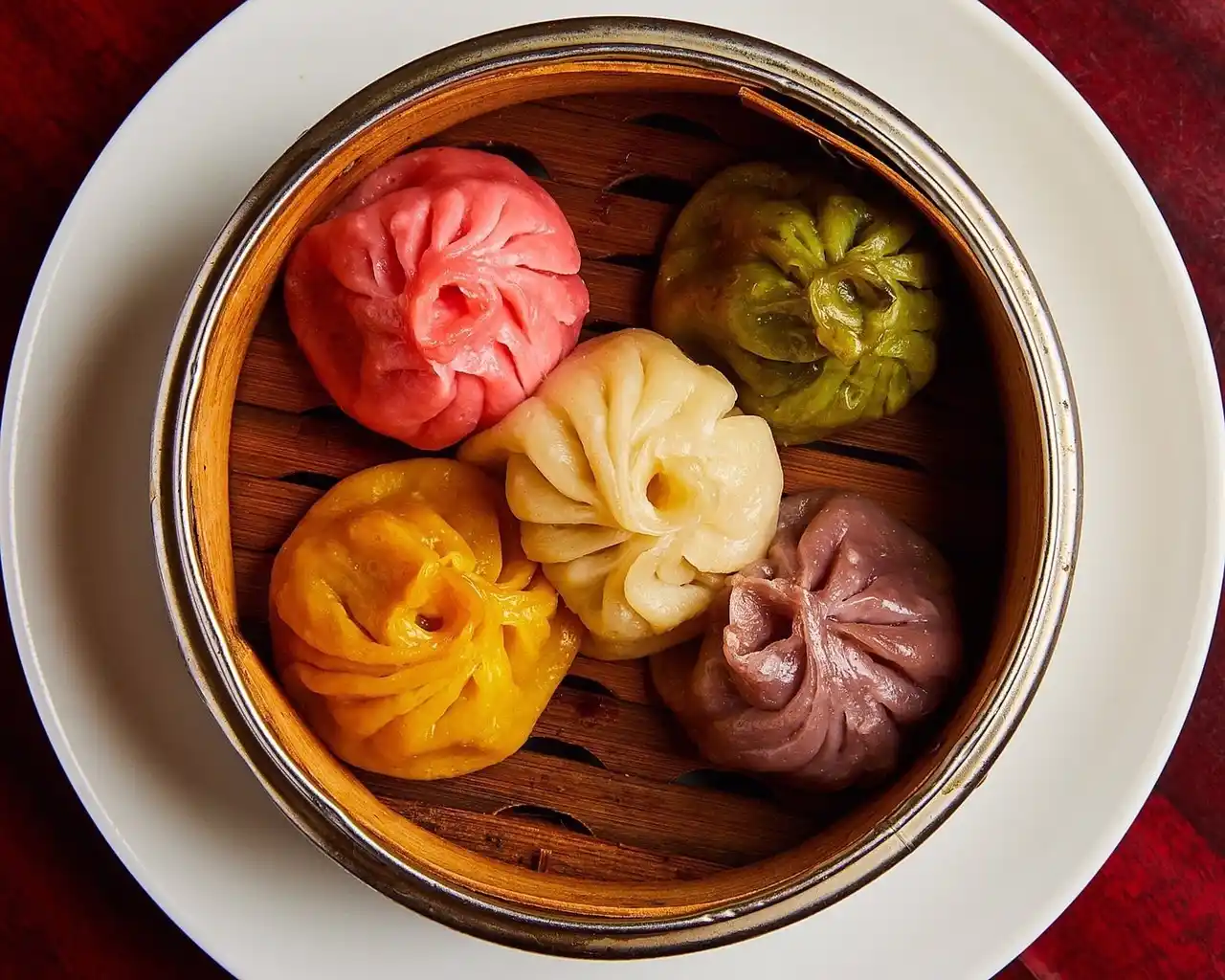 ・五色小籠包 ¥880 (税込¥968) 当店自慢の「五色小籠包」!「エビ(ピンク)」「豚肉(白)」「フカヒレ(オレンジ)」「鶏肉(緑)」「牛肉(紫)」と五種類の味が楽しめます!色鮮やかな小籠包は写真映え間違いなし。一度は食べて頂きたい一品です。 |