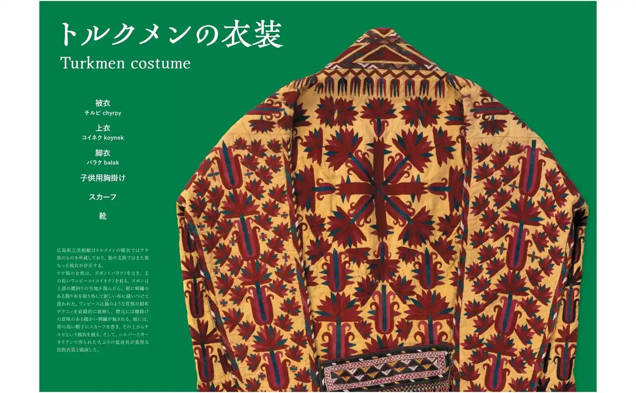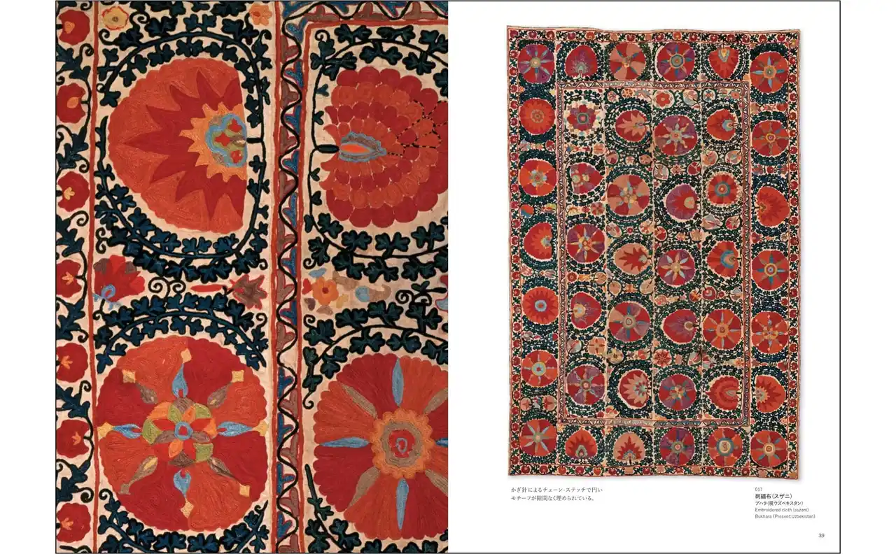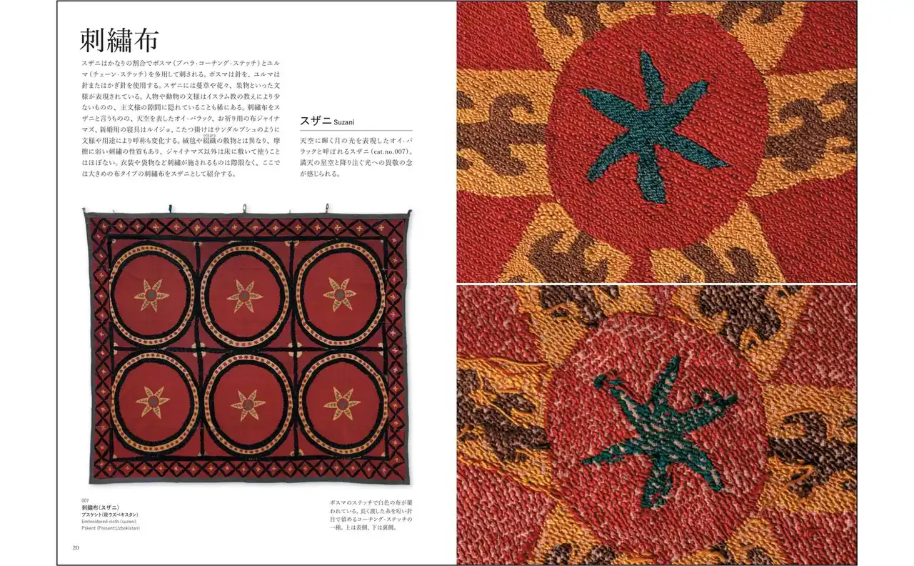 | 第1章ではウズベクの「スザニ」を中心に精緻な刺繡布とかわいい刺繡袋を、第2章ではトルクメンのものを軸として高い芸術性と独自性で注目される「頭飾り」「胸飾り」「背飾り」などを、第3章ではウズベク、トルクメンそれぞれの鮮やかな色彩と賑やかな大柄の文様が個性的な衣装を紹介します。 | |||||||||||||||