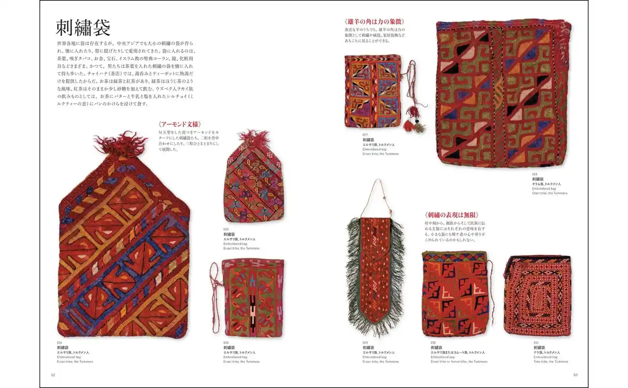 | アーモンド文様 雄羊の角は力の象徴/刺繡の表現は無限 まるで小さなスザニ ラカイ独特の美意識 多彩なクロス・ステッチ 絹経絣とベルベット/豪華な金銀糸刺繡 花開く文様/織物に見えて実は刺繡 雄羊の角文様いろいろ/アフガニスタンのパシュトゥーン ペルシアの繊細/パッチワークの魅力/聖典コーランを大切に包む トルクメンの刺繡袋/トルクメン ヨムートの緻密なステッチ | |||||||||||||||