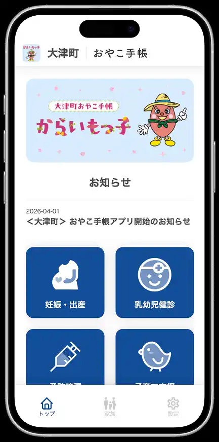 今回、新たに導入した「大津町おやこ手帳 からいもっ子」は、妊娠期から子育て期までをサポートする便利なアプリです。地元の特産品『からいも』にちなみ、こどもたちが大津町で育まれるようにとの願いを込めました。 |