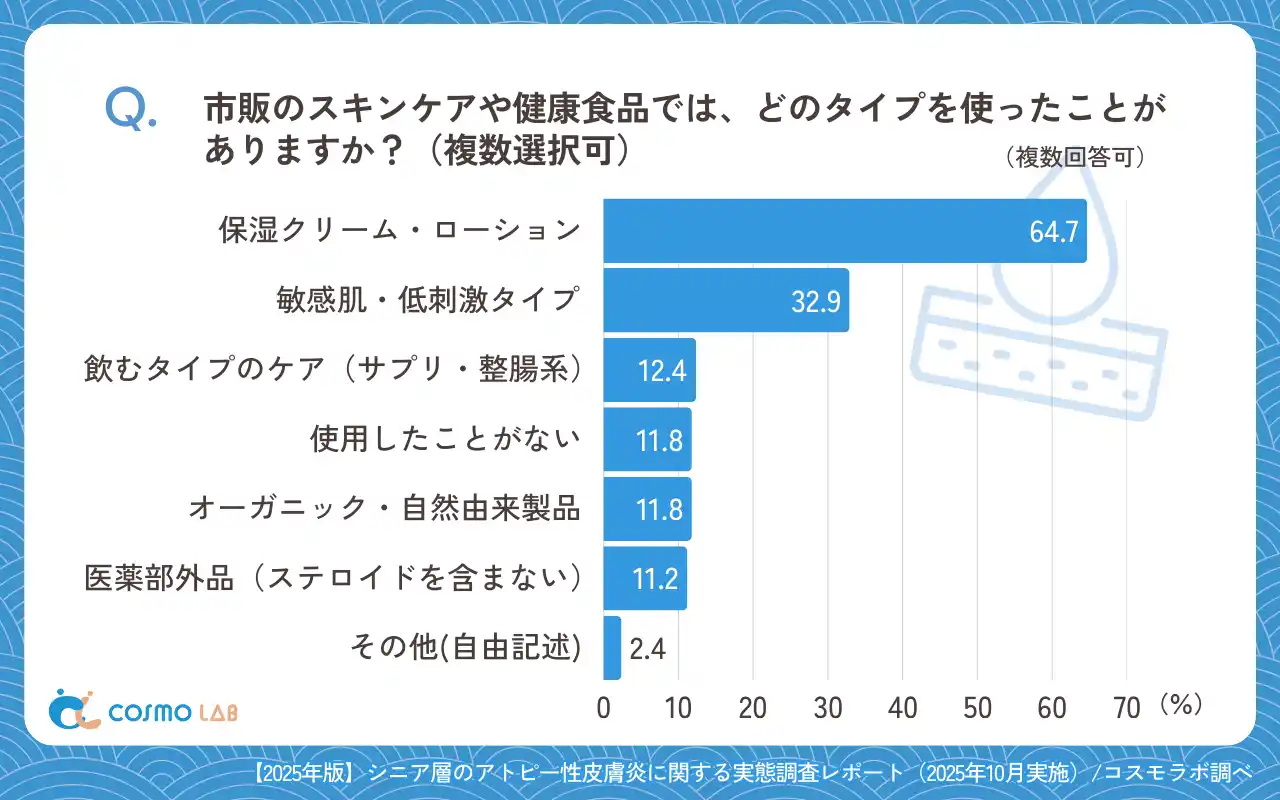 最多は「保湿クリーム・ローション」(64.7%)で、市販品でのケアが中心であると明らかになりました。 |