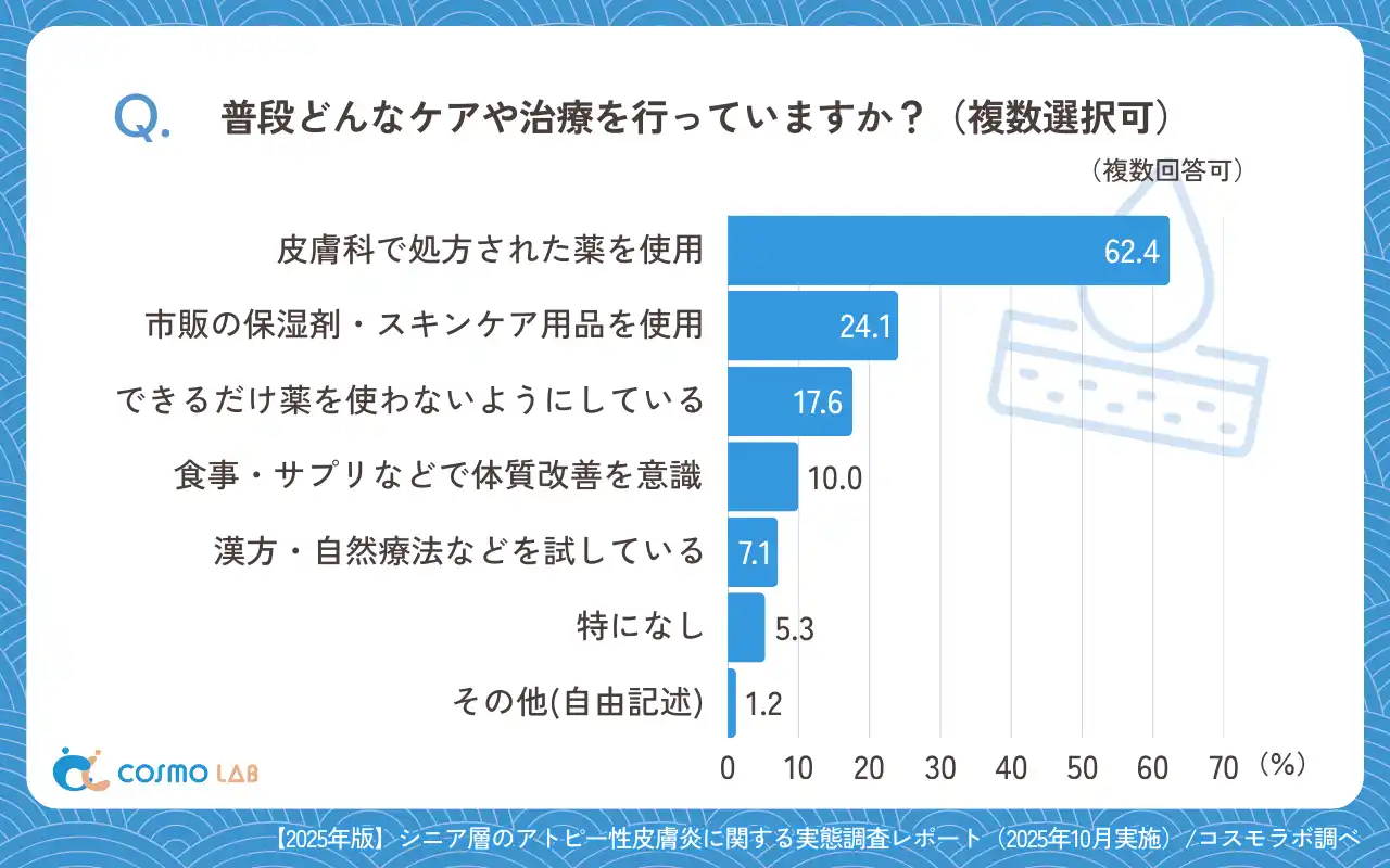 「皮膚科で処方された薬を使用」(62.4%)と回答したシニアが中心で、続いて「市販の保湿剤・スキンケア用品を使用」(24.1%)という回答結果になりました。 |