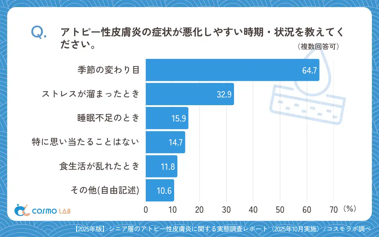 「季節の変わり目」(64.7%)が突出し、悪化要因として環境変化が最も強く意識されています。 |
