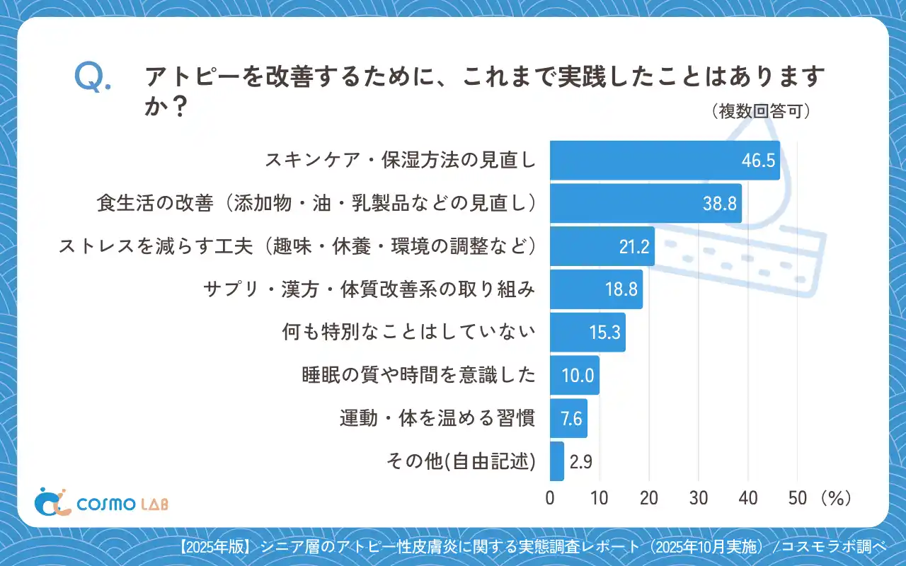 「スキンケア・保湿方法の見直し」(46.5%)が最多で、「食生活の改善(添加物・油・乳製品などの見直し)」(38.8%)という回答が続きました。 |