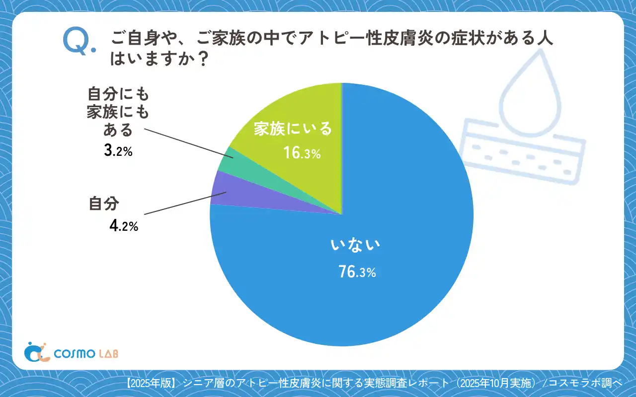 このことから、自分にアトピー性皮膚炎の症状があるシニアは少数派だと分かりました。一方で、自分の家族が当事者であるケースは、一定数において見受けられます。 |