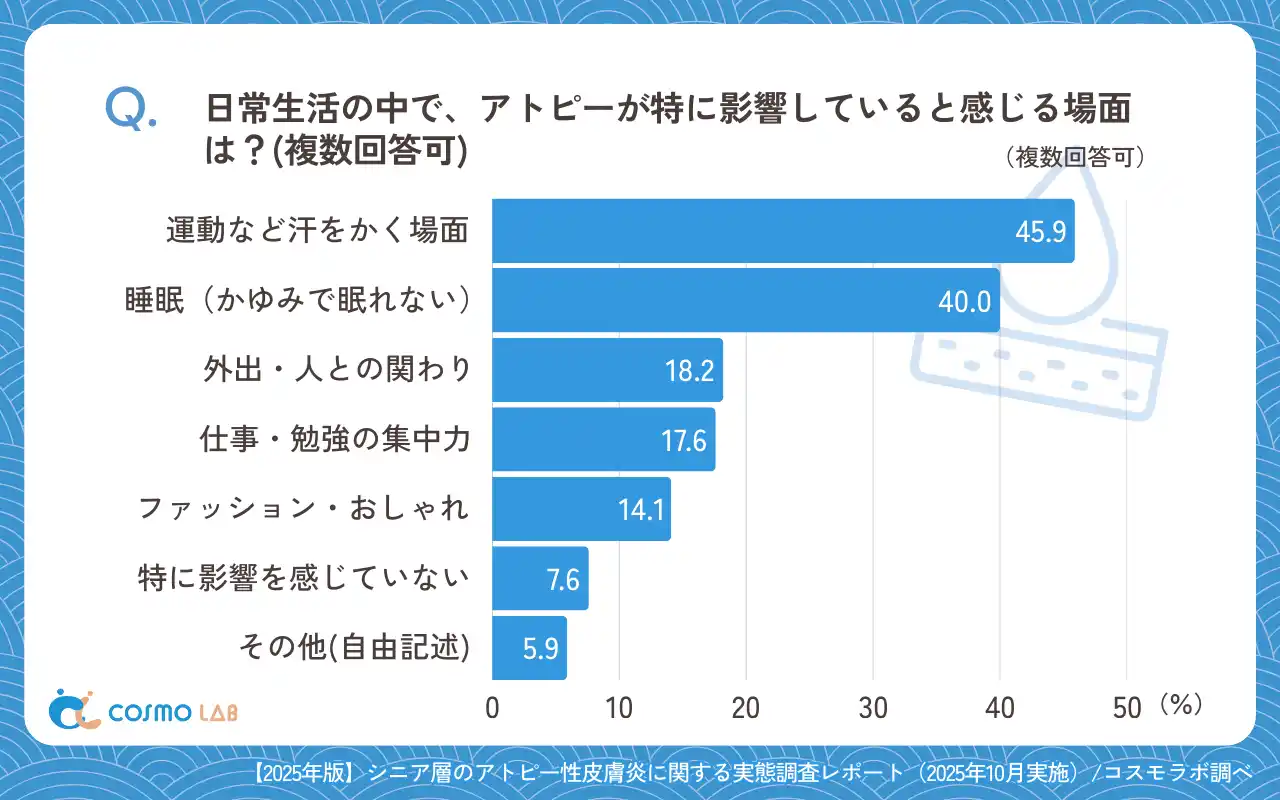 「運動など汗をかく場面」(45.9%)が最多で、「睡眠(かゆみで眠れない)」(40.0%)と続きました。 |