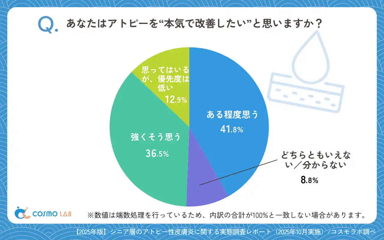 「ある程度思う」(41.8%)が最多で、「強くそう思う」(36.5%)が続き、アトピー性皮膚炎を改善したいと考えるシニアが多いと分かりました。 |