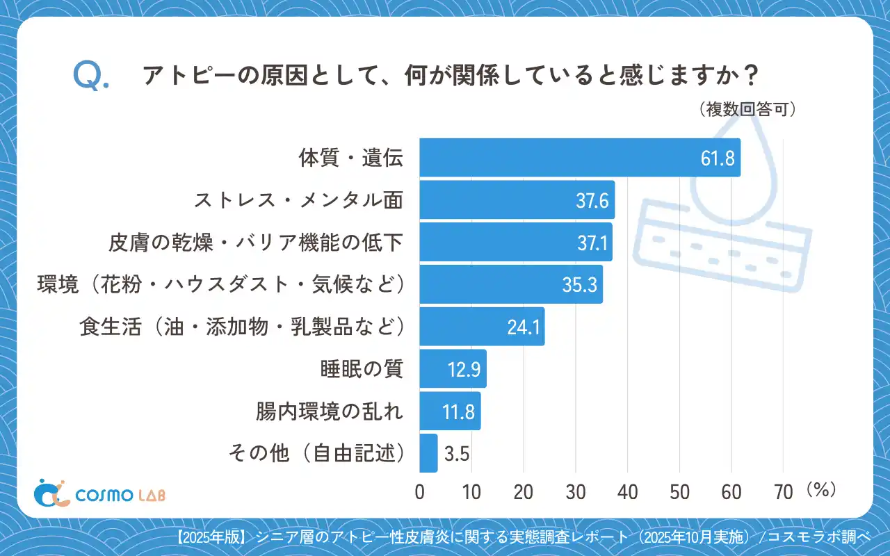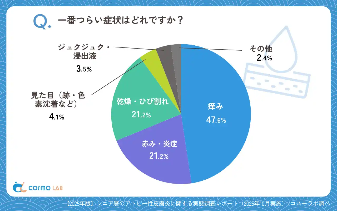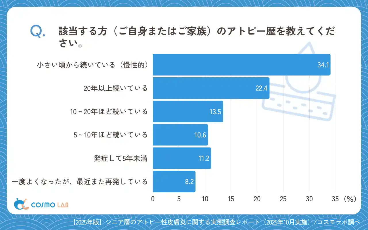 シニア専門のマーケティングプラットホーム コスモラボ(会社名:コスモヘルス株式会社、本社:東京都港区、代表取締役社長 小塚 崇史)がシニア層の『アトピー性皮膚炎』に関するアンケートリサーチのレポートをリリースしました。本レポートでは、50代以上のシニア層を対象にアトピー性皮膚炎に関するアンケート調査結果を分析しました。アトピー歴をはじめ、症状の有無や程度、悪化する要因だと思う内容、生活に対する影響、ケアや治療内容、医薬品への意識、改善意欲までを整理し、当事者支援に向けた情報をまとめました。