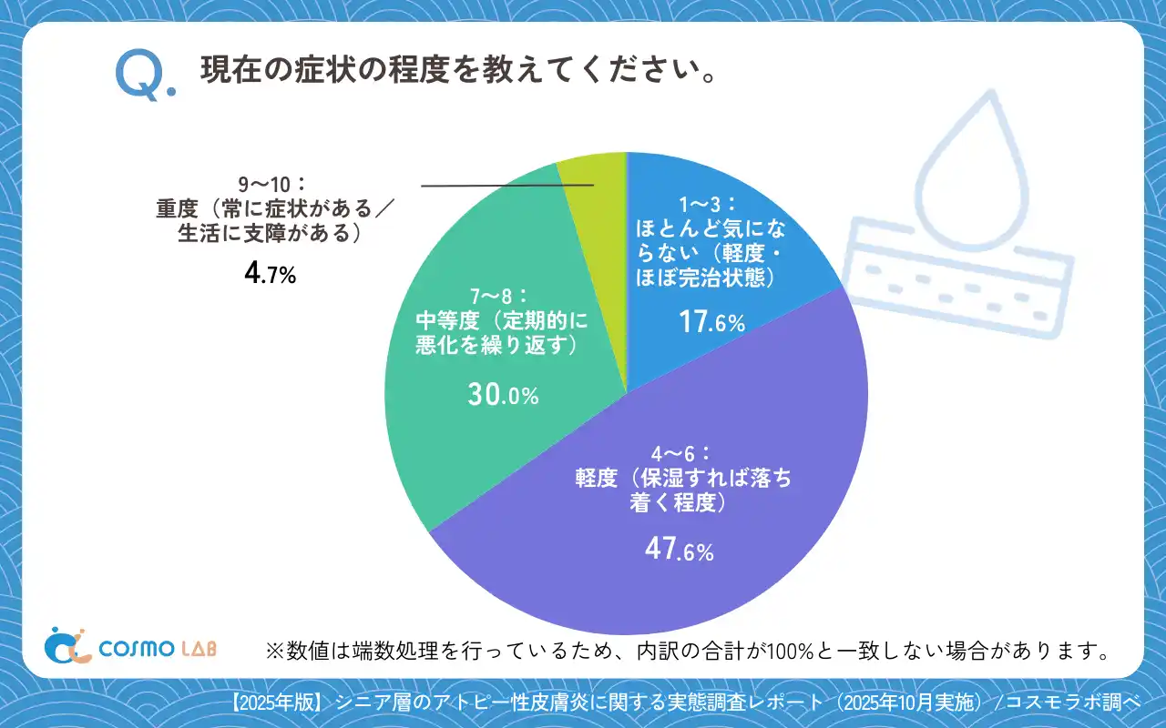 「1~3:ほとんど気にならない(軽度・ほぼ完治状態)」(17.6%)も一定数存在し、「9~10:重度(常に症状がある/生活に支障がある)」(4.7%)は少数です。 |