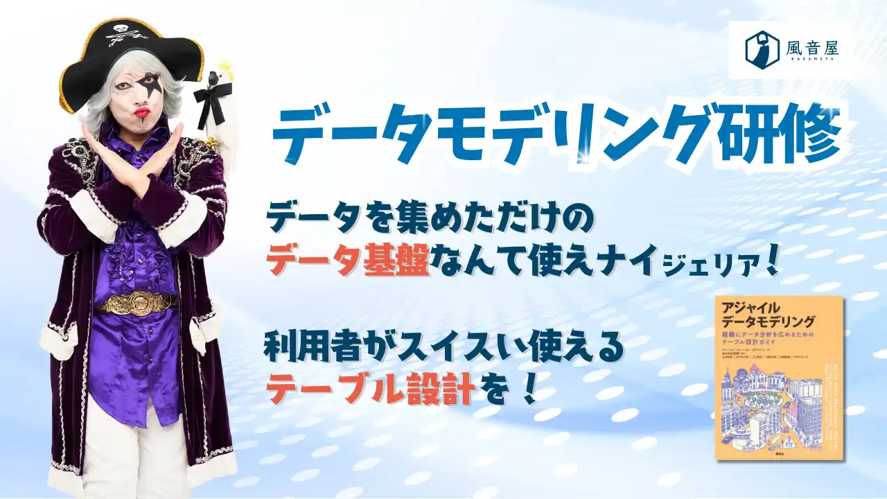 風音屋にはこのような相談が多く寄せられており、日本企業のデータ活用やDX推進を阻害する要因の1つが「データモデリングを体系的に学ぶ実践型プログラムの不足」だと認識しています。そこで、書籍『アジャイルデータモデリング』の訳者である「ゆずたそ(@yuzutas0)」が主体となって、研修プログラムを開発しました。 |