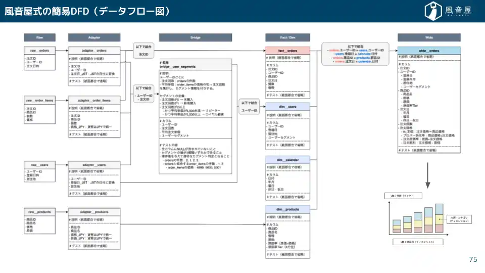 ディメンショナルモデリングの基礎を学び、SQLやPython、Excelで実装するところまで扱います。 |