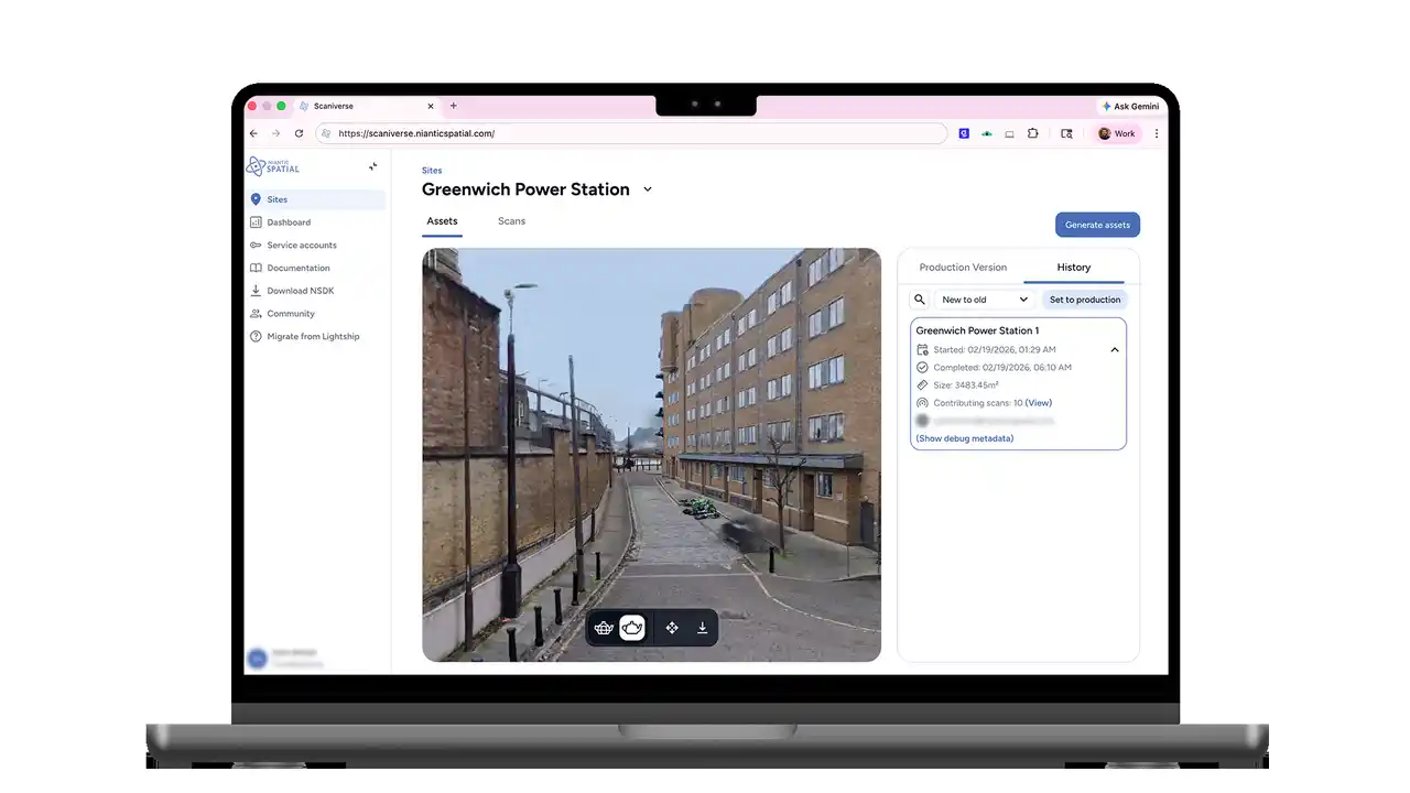 Scaniverse ビュアーでアセット処理とレビュー: メッシュ・スプラット・ロケーションマップを生成して、Niantic Spatial VPS を通してプレビュー。360°カメラからのデータの VPS 対応も近日公開予定です。 |