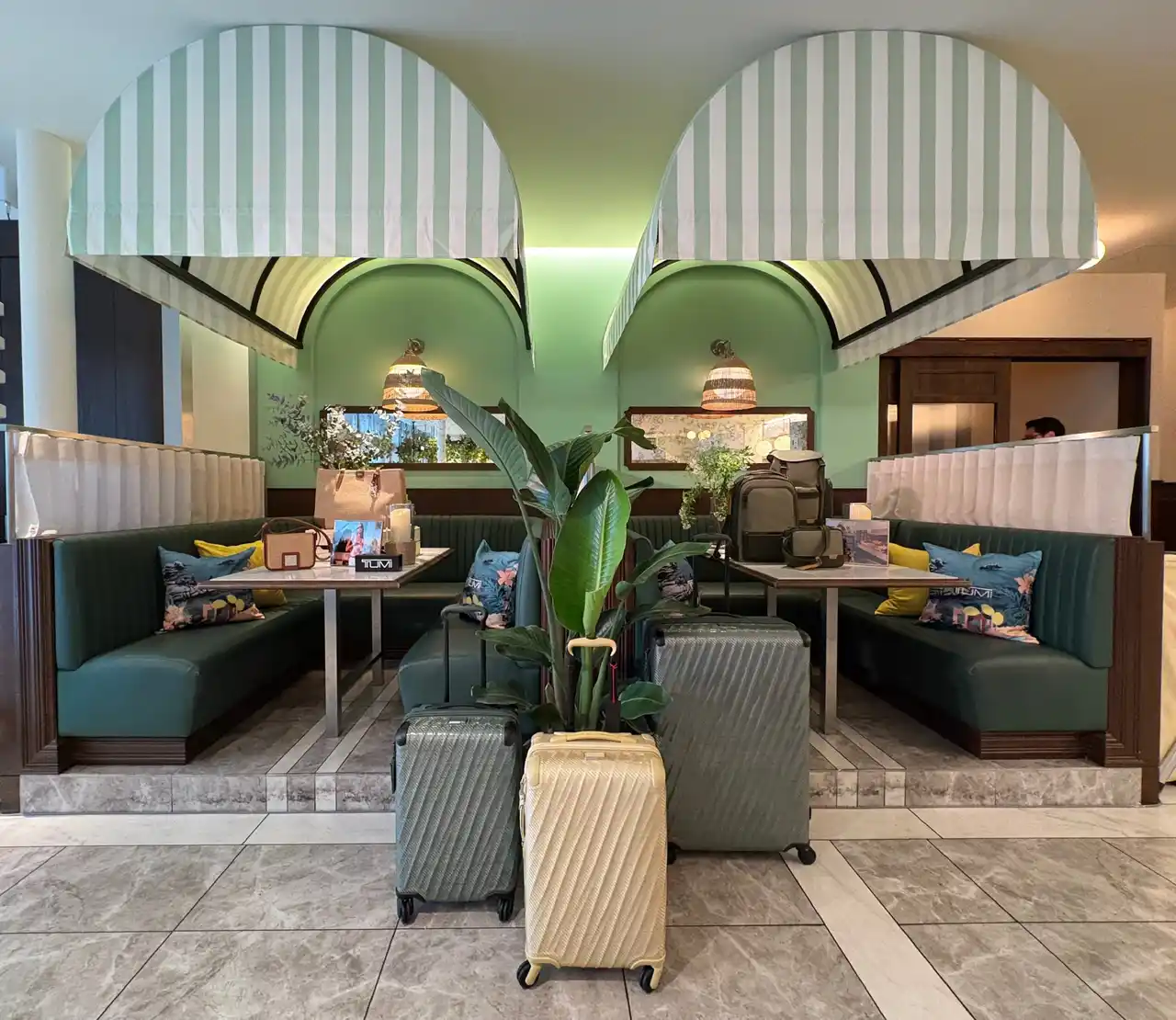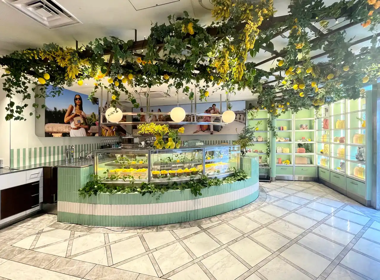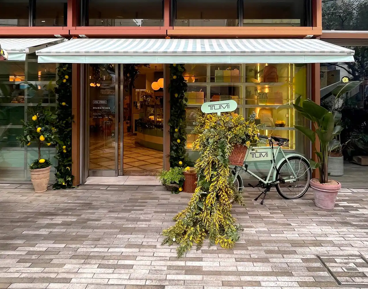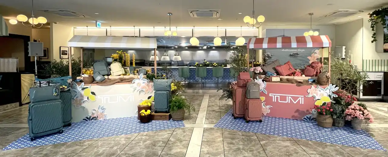 来場者は、都会の喧騒を離れ、アマルフィ海岸を思わせる夏のリゾートムードあふれる空間を楽しみました。会場は、やわらかなイエローや陽光を思わせるテラコッタカラーのストール、シーズンカラーのメディテレーニアン プリントのパラソルで装飾されたテラス席など、活気ある地中海の市場をイメージした空間を演出し、地中海の夏の暮らしを思わせる情景を再現しました。さらに、花々や豊かなグリーン、フレッシュなレモンで彩られた会場では、来場者がヨーロッパスタイルのフィンガーフードやワークショップ体験を楽しみながら、トゥミの新たなコレクションを堪能しました。 |